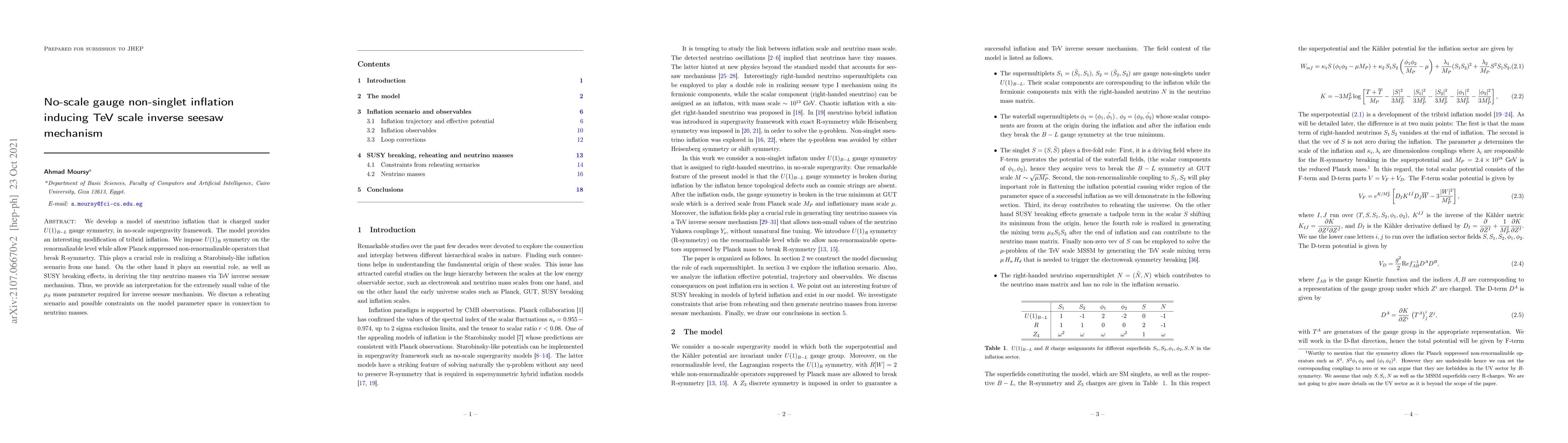 We develop a model of sneutrino inflation that is charged under $U(1)_{B-L}$ gauge symmetry in no-scale supergravity framework. The model provides an interesting modification of tribrid inflation. We impose $U(1)_R$ symmetry on the renormalizable level while allow Planck suppressed non-renormalizable operators that break R-symmetry. This plays a crucial role in realizing a Starobinsly-like inflation scenario from one hand. On the other hand it plays essential role, as well as SUSY breaking effects, in deriving the neutrino masses from TeV inverse seesaw mechanism. Thus we provide an interpretation for the extremely small value of the $\mu_S$ mass parameter required for inverse seesaw mechanism. We discuss the reheating scenario and the possible constraints on the parameter space in connection to neutrino masses.