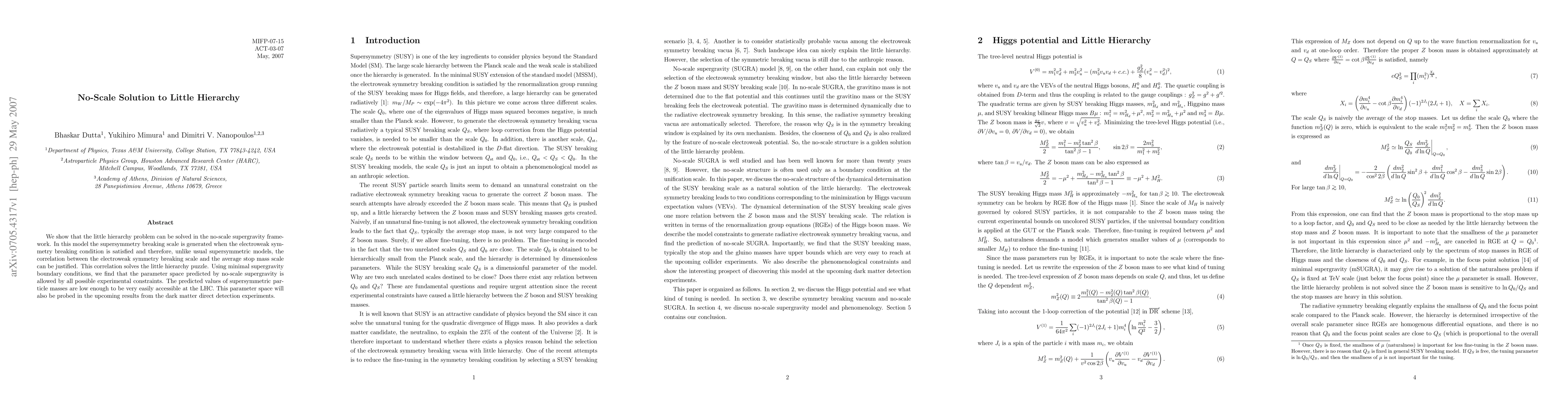 The paper proposes a no-scale supergravity framework to solve the little hierarchy problem by correlating the electroweak symmetry breaking scale with the average stop mass scale, making the parameter space experimentally viable and accessible at the LHC and dark matter experiments. This model satisfies all experimental constraints and predicts low supersymmetric particle masses.