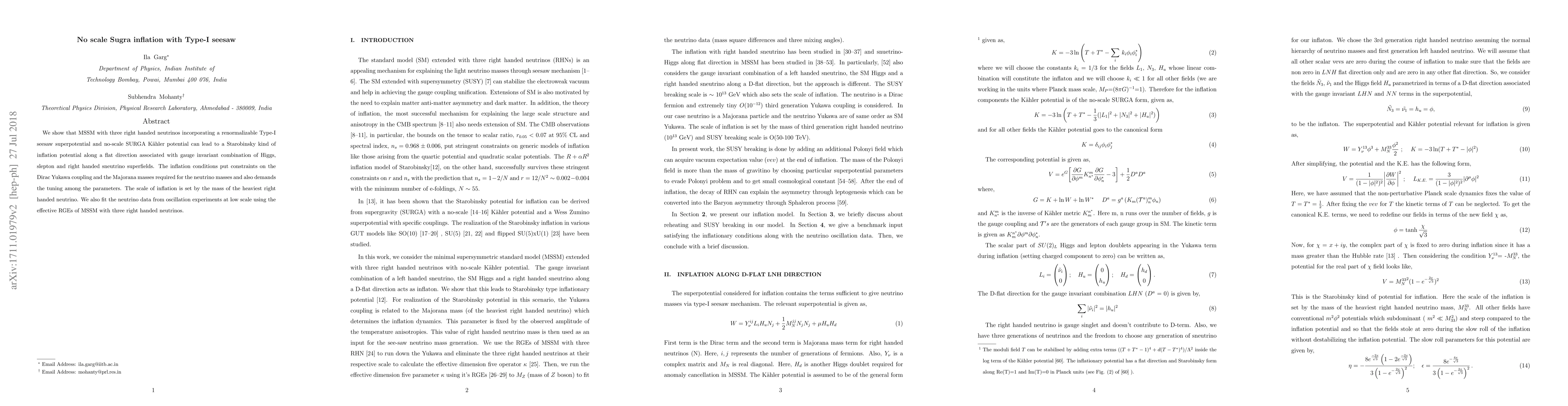 We show that MSSM with three right handed neutrinos incorporating a renormalizable Type-I seesaw superpotential and no-scale SURGA K\"{a}hler potential can lead to a Starobinsky kind of inflation potential along a flat direction associated with gauge invariant combination of Higgs, slepton and right handed sneutrino superfields. The inflation conditions put constraints on the Dirac Yukawa coupling and the Majorana masses required for the neutrino masses and also demands the tuning among the parameters. The scale of inflation is set by the mass of the heaviest right handed neutrino. We also fit the neutrino data from oscillation experiments at low scale using the effective RGEs of MSSM with three right handed neutrinos.