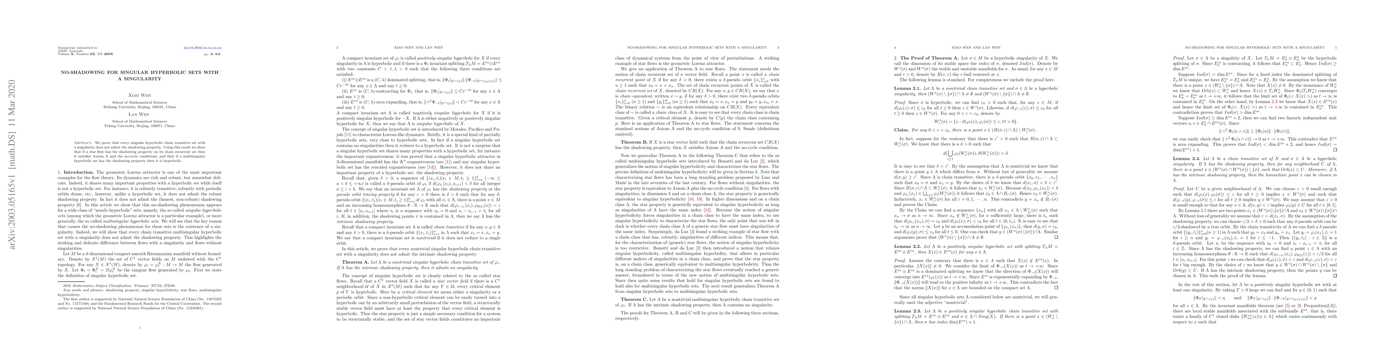 We prove that every singular hyperbolic chain transitive set with a singularity does not admit the shadowing property. Using this result we show that if a star flow has the shadowing property on its chain recurrent set then it satisfies Axiom A and the no-cycle conditions; and that if a multisingular hyperbolic set has the shadowing property then it is hyperbolic.