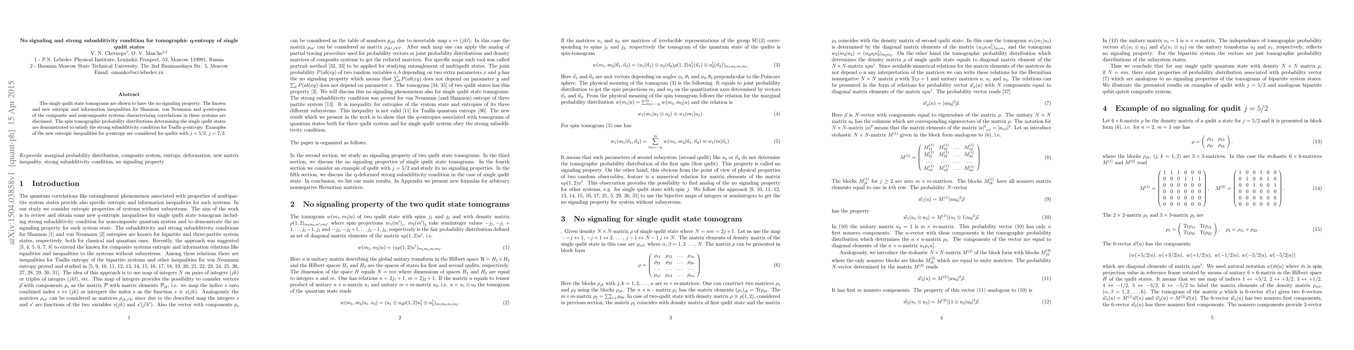 The single qudit state tomograms are shown to have the no signaling property. The known and new entropic and information inequalities for Shannon, von Neumann and q-entropies of the composite and noncomposite systems characterizing correlations in these systems are discussed. The spin tomographic probability distributions determining the single qudit states are demonstrated to satisfy the strong subadditivity condition for Tsallis q-entropy. Examples of the new entropic inequalities for q-entropy are considered for qudits with j = 5=2, j = 7=2.