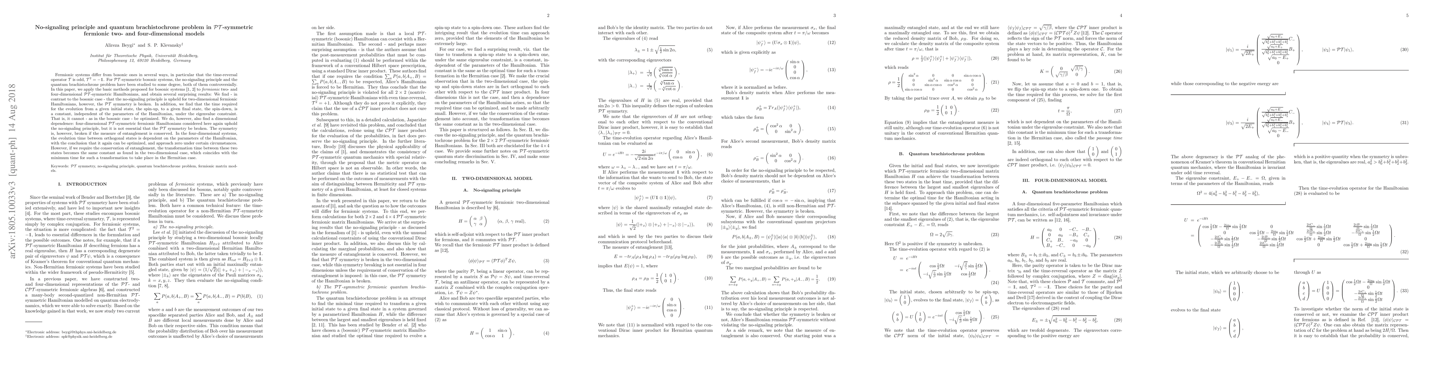 Fermionic systems differ from bosonic ones in several ways, in particular that the time-reversal operator $T$ is odd, $T^2=-1$. For $PT$-symmetric bosonic systems, the no-signaling principle and the quantum brachistochrone problem have been studied to some degree, both of them controversially. In this paper, we apply the basic methods proposed for bosonic systems to {\it fermionic} two- and four-dimensional $PT$-symmetric Hamiltonians, and obtain several surprising results: We find - in contrast to the bosonic case - that the no-signaling principle is upheld for two-dimensional fermionic Hamiltonians, however, the $PT$ symmetry is broken. In addition, we find that the time required for the evolution from a given initial state, the spin-up, to a given final state, the spin-down, is a constant, independent of the parameters of the Hamiltonian, under the eigenvalue constraint. That is, it cannot - as in the bosonic case - be optimized. We do, however, also find a dimensional dependence: four-dimensional $PT$-symmetric fermionic Hamiltonians considered here again uphold the no-signaling principle, but it is not essential that the $PT$ symmetry be broken. The symmetry is, however, broken if the measure of entanglement is conserved. In the four-dimensional systems, the evolution time between orthogonal states is dependent on the parameters of the Hamiltonian, with the conclusion that it again can be optimized, and approach zero under certain circumstances. However, if we require the conservation of entanglement, the transformation time between these two states becomes the same constant as found in the two-dimensional case, which coincides with the minimum time for such a transformation to take place in the Hermitian case.