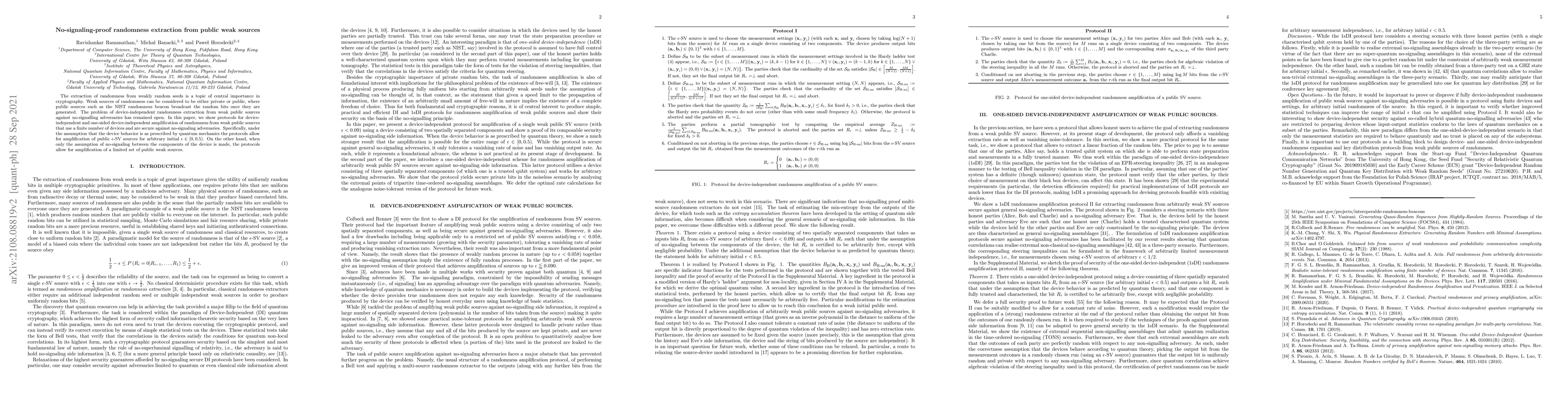This paper presents protocols for amplifying randomness from weak public Santha Vazirani (SV) sources using a finite number of devices, ensuring security against no-signalling adversaries. The protocols achieve device-independent and one-sided device-independent amplification, leveraging quantum mechanics for broader applicability.