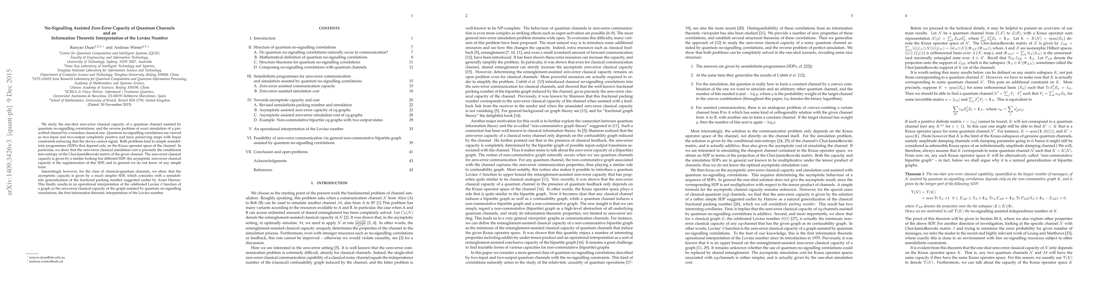 We study the one-shot zero-error classical capacity of a quantum channel assisted by quantum no-signalling correlations, and the reverse problem of exact simulation of a prescribed channel by a noiseless classical one. Quantum no-signalling correlations are viewed as two-input and two-output completely positive and trace preserving maps with linear constraints enforcing that the device cannot signal. Both problems lead to simple semidefinite programmes (SDPs) that depend only on the Kraus operator space of the channel. In particular, we show that the zero-error classical simulation cost is precisely the conditional min-entropy of the Choi-Jamiolkowski matrix of the given channel. The zero-error classical capacity is given by a similar-looking but different SDP; the asymptotic zero-error classical capacity is the regularization of this SDP, and in general we do not know of any simple form. Interestingly however, for the class of classical-quantum channels, we show that the asymptotic capacity is given by a much simpler SDP, which coincides with a semidefinite generalization of the fractional packing number suggested earlier by Aram Harrow. This finally results in an operational interpretation of the celebrated Lovasz $\vartheta$ function of a graph as the zero-error classical capacity of the graph assisted by quantum no-signalling correlations, the first information theoretic interpretation of the Lovasz number.
