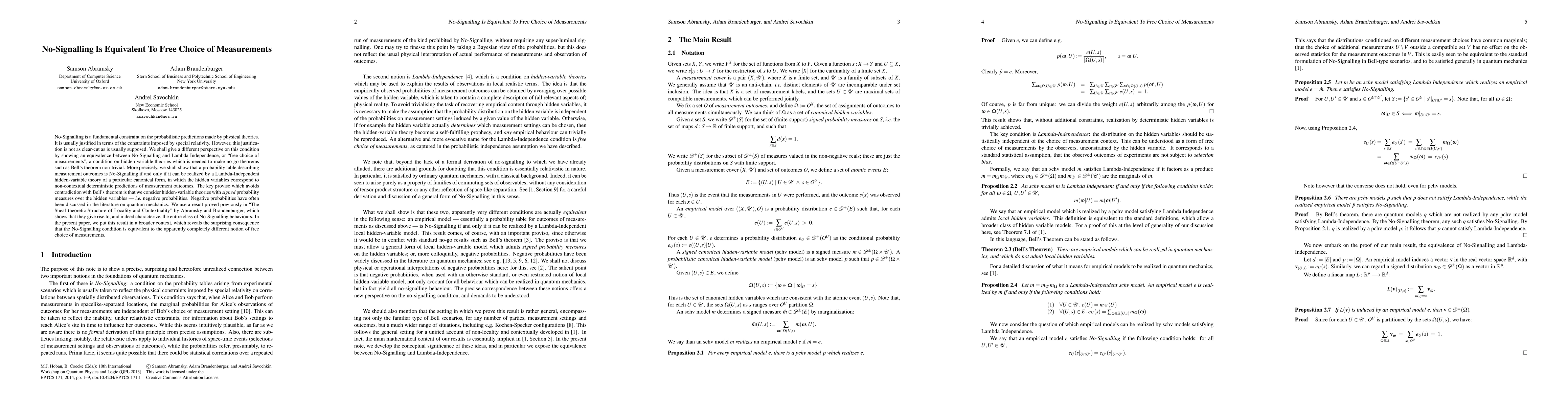 No-Signalling is a fundamental constraint on the probabilistic predictions made by physical theories. It is usually justified in terms of the constraints imposed by special relativity. However, this justification is not as clear-cut as is usually supposed. We shall give a different perspective on this condition by showing an equivalence between No-Signalling and Lambda Independence, or "free choice of measurements", a condition on hidden-variable theories which is needed to make no-go theorems such as Bell's theorem non-trivial. More precisely, we shall show that a probability table describing measurement outcomes is No-Signalling if and only if it can be realized by a Lambda-Independent hidden-variable theory of a particular canonical form, in which the hidden variables correspond to non-contextual deterministic predictions of measurement outcomes. The key proviso which avoids contradiction with Bell's theorem is that we consider hidden-variable theories with signed probability measures over the hidden variables - i.e. negative probabilities. Negative probabilities have often been discussed in the literature on quantum mechanics. We use a result proved previously in "The Sheaf-theoretic Structure of Locality and Contextuality" by Abramsky and Brandenburger, which shows that they give rise to, and indeed characterize, the entire class of No-Signalling behaviours. In the present paper, we put this result in a broader context, which reveals the surprising consequence that the No-Signalling condition is equivalent to the apparently completely different notion of free choice of measurements.