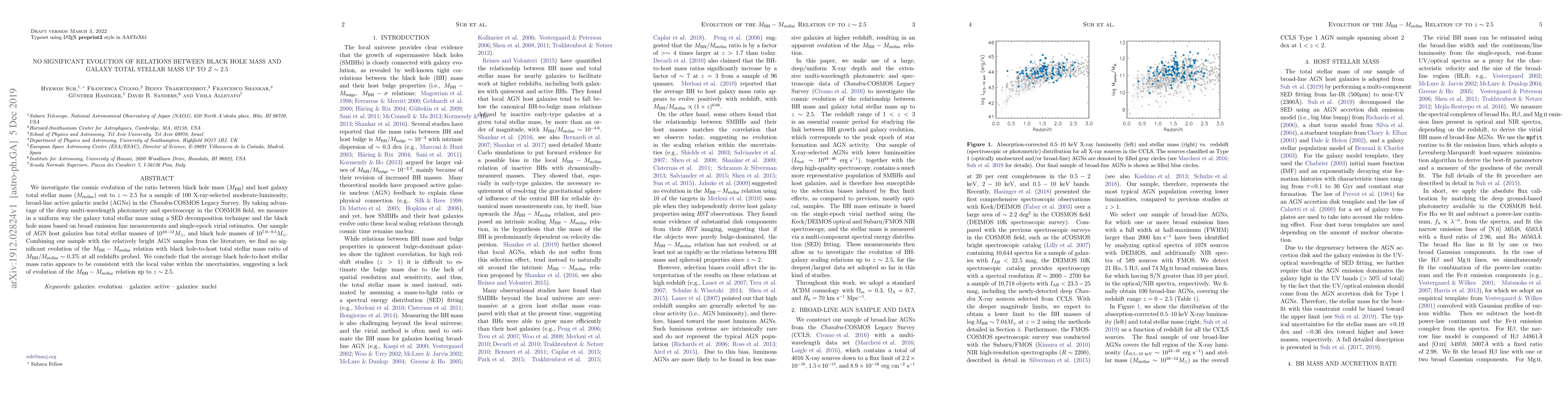 This study finds no significant evolution in the black hole mass to galaxy total stellar mass ratio (MBH/Mstellar) up to z~2.5 for a sample of moderate-luminosity AGNs in the Chandra-COSMOS Legacy Survey. The MBH-Mstellar ratio remains at ~0.3% across the observed redshifts, indicating no substantial change from local values.