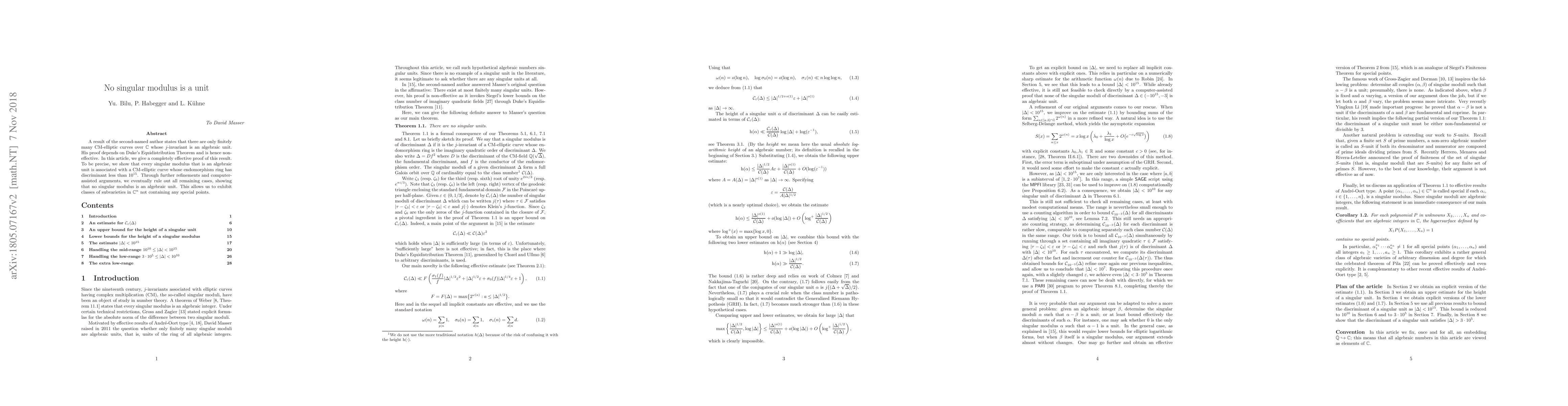 Researchers prove that no singular modulus is an algebraic unit, ruling out a class of special points in complex geometry.
