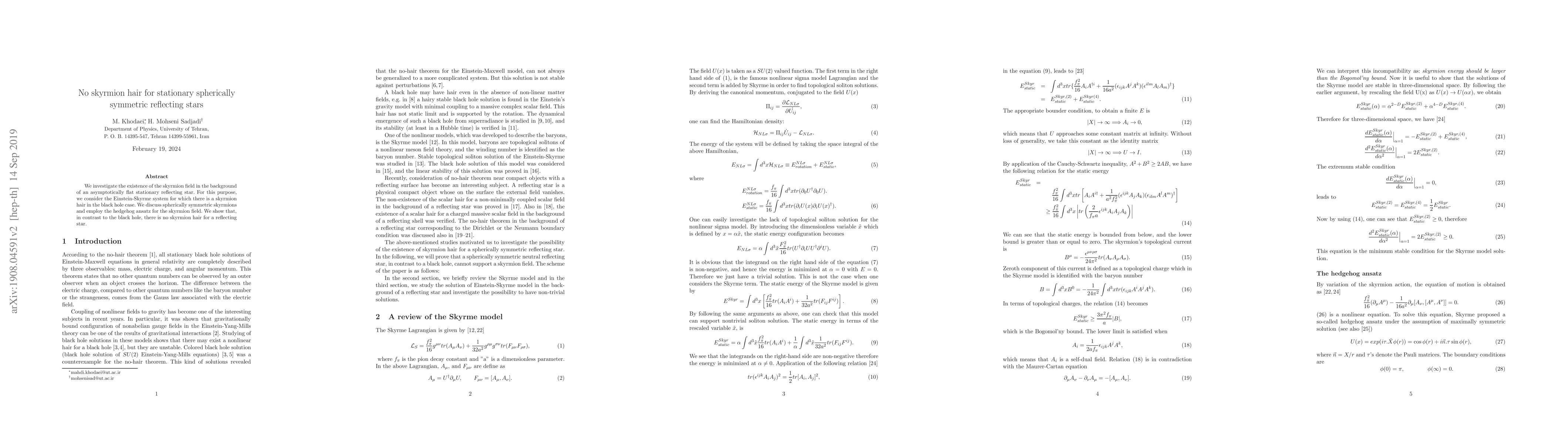 This paper explores the Einstein Skyrme system to determine if skyrmion fields exist in the background of a stationary, reflecting star. It finds that unlike in black hole scenarios, there is no skyrmion hair present in reflecting stars.