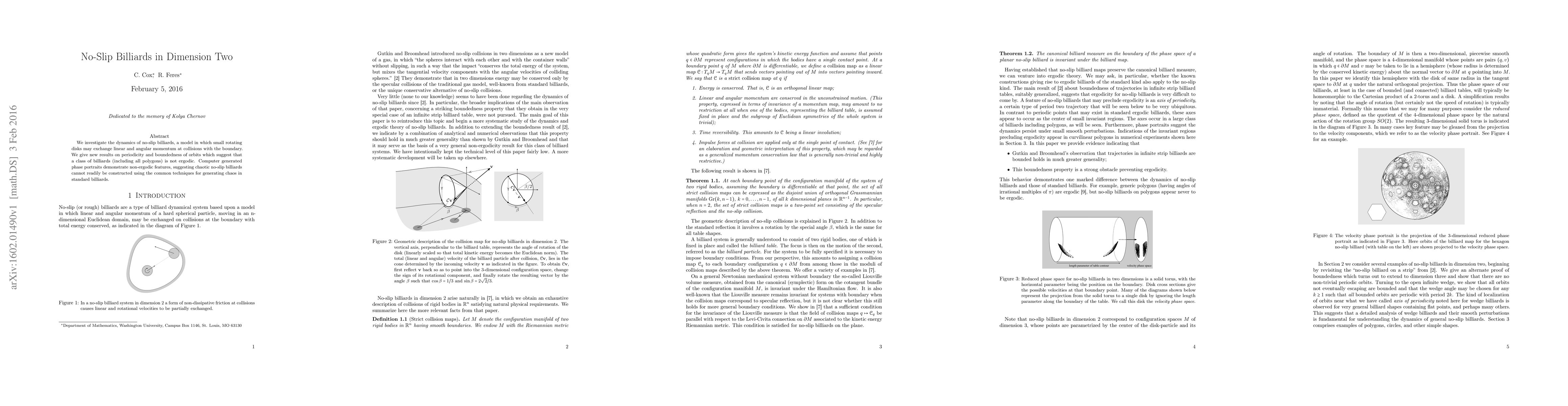 We investigate the dynamics of no-slip billiards, a model in which small rotating disks may exchange linear and angular momentum at collisions with the boundary. We give new results on periodicity and boundedness of orbits which suggest that a class of billiards (including all polygons) is not ergodic. Computer generated phase portraits demonstrate non-ergodic features, suggesting chaotic no-slip billiards cannot readily be constructed using the common techniques for generating chaos in standard billiards.