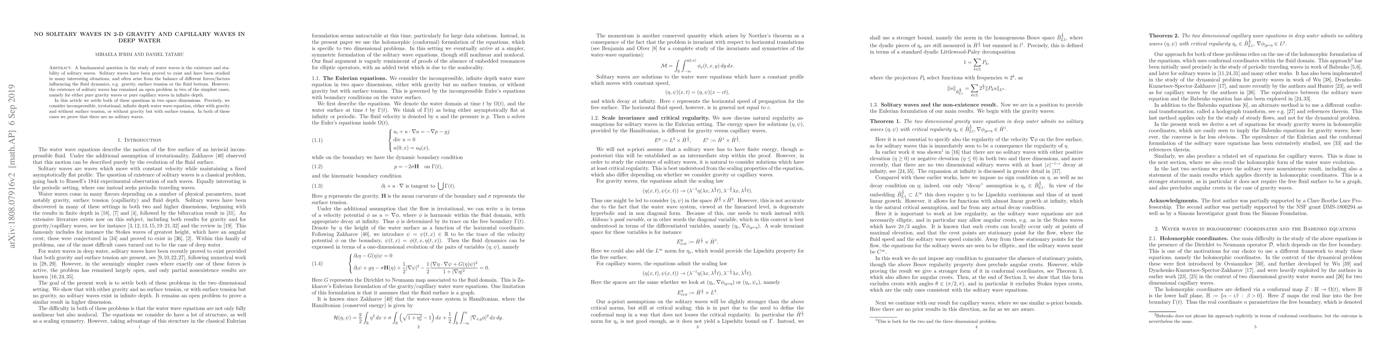 The paper presents a rigorous mathematical proof of nonexistence of solitary waves for gravity and capillary waves using advanced techniques in holomorphic coordinates and symplectic geometry.