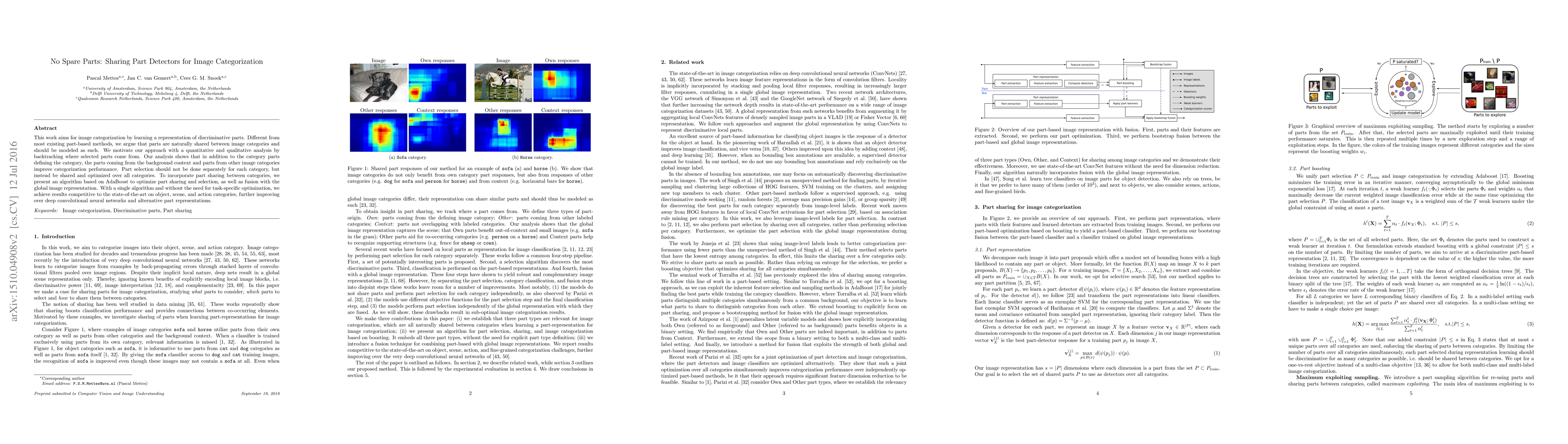 This work aims for image categorization using a representation of distinctive parts. Different from existing part-based work, we argue that parts are naturally shared between image categories and should be modeled as such. We motivate our approach with a quantitative and qualitative analysis by backtracking where selected parts come from. Our analysis shows that in addition to the category parts defining the class, the parts coming from the background context and parts from other image categories improve categorization performance. Part selection should not be done separately for each category, but instead be shared and optimized over all categories. To incorporate part sharing between categories, we present an algorithm based on AdaBoost to jointly optimize part sharing and selection, as well as fusion with the global image representation. We achieve results competitive to the state-of-the-art on object, scene, and action categories, further improving over deep convolutional neural networks.