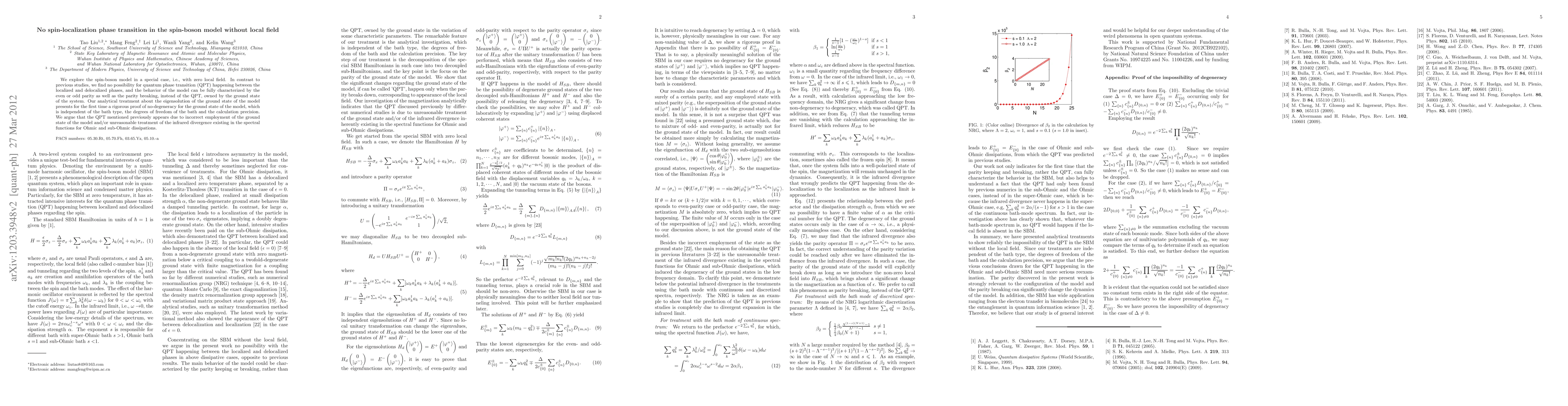 Research investigates spin-boson model without local field, finding no quantum phase transition between localized and delocalized phases. The behavior of the model is characterized by parity and ground state degeneracy, contradicting previous findings.