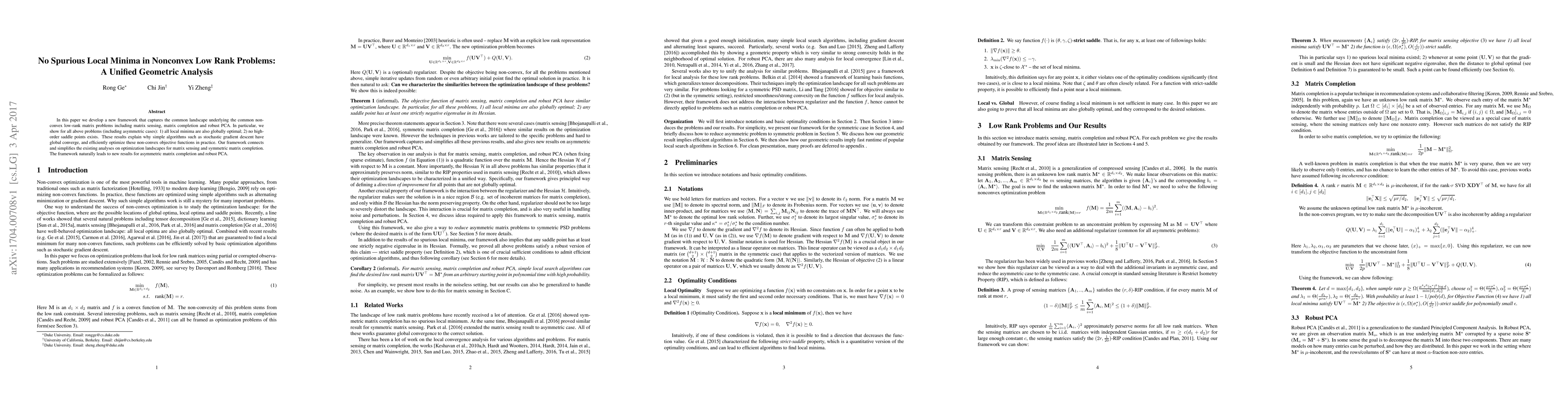 A new framework shows that local minima in non-convex low-rank matrix problems are also globally optimal, eliminating high-order saddle points.