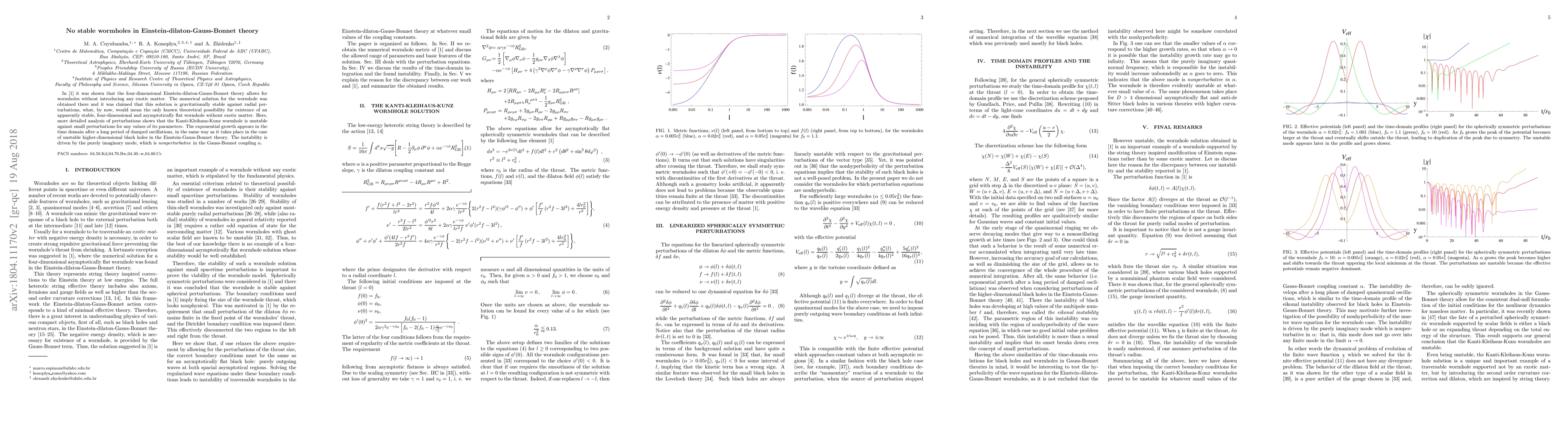 In [P. Kanti, B. Kleihaus, J. Kunz, Phys. Rev. Lett. 107, 271101 (2011)] it was shown that the four-dimensional Einstein-dilaton-Gauss-Bonnet theory allows for wormholes without introducing any exotic matter. The numerical solution for the wormhole was obtained there and it was claimed that this solution is gravitationally stable against radial perturbations, what, by now, would mean the only known theoretical possibility for existence of an apparently stable, four-dimensional and asymptotically flat wormhole without exotic matter. Here, more detailed analysis of perturbations shows that the Kanti-Kleihaus-Kunz wormhole is unstable against small perturbations for any values of its parameters. The exponential growth appears in the time domain after a long period of damped oscillations, in the same way as it takes place in the case of unstable higher-dimensional black holes in the Einstein-Gauss-Bonnet theory. The instability is driven by the purely imaginary mode, which is nonperturbative in the Gauss-Bonnet coupling$\alpha$.