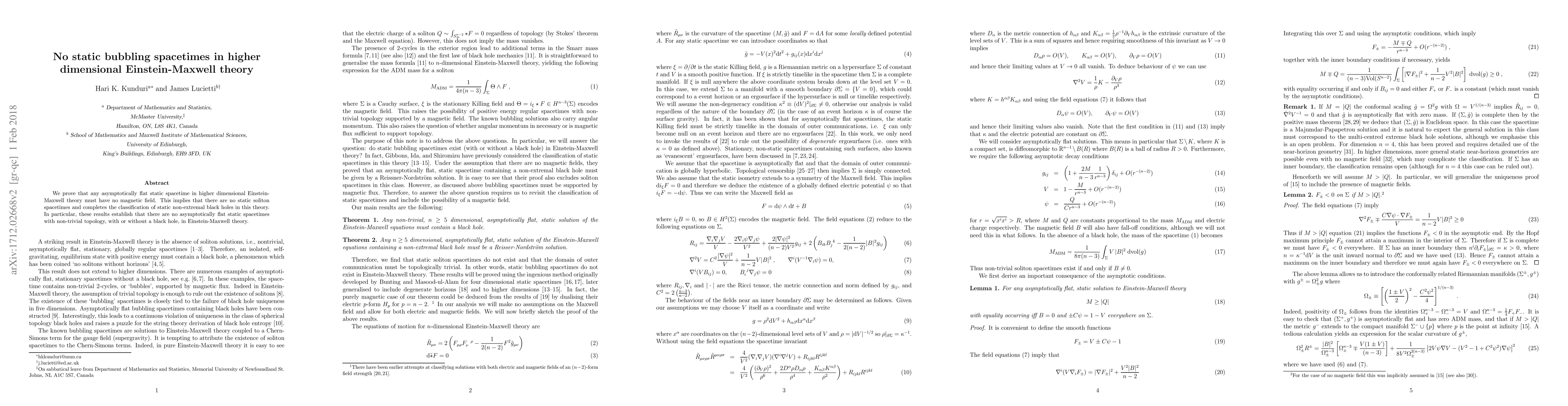 We prove that any asymptotically flat static spacetime in higher dimensional Einstein-Maxwell theory must have no magnetic field. This implies that there are no static soliton spacetimes and completes the classification of static non-extremal black holes in this theory. In particular, these results establish that there are no asymptotically flat static spacetimes with non-trivial topology, with or without a black hole, in Einstein-Maxwell theory.
