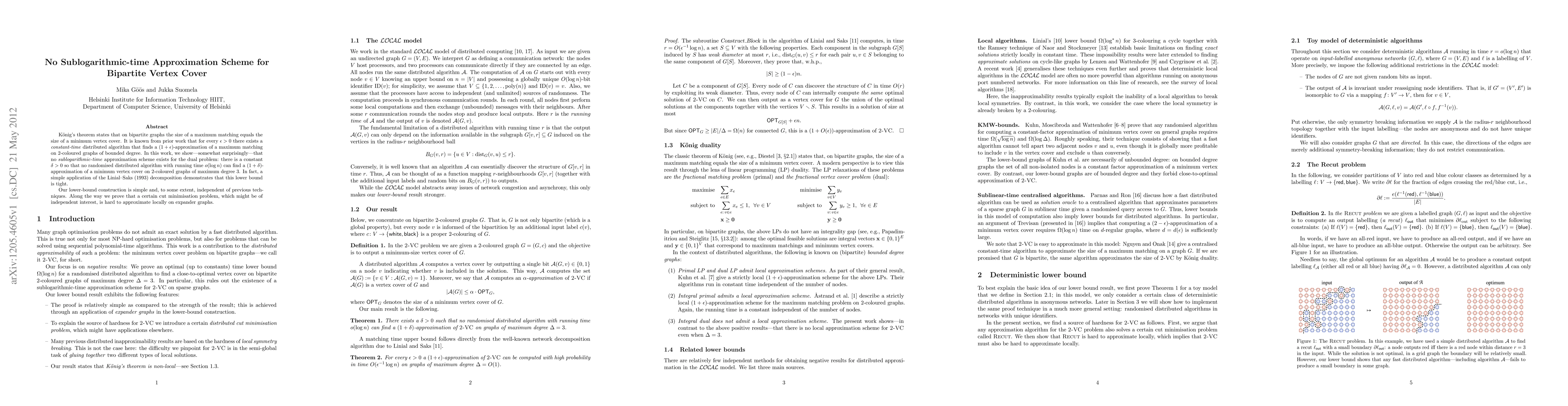 This paper demonstrates that no sublogarithmic-time approximation scheme exists for finding a minimum vertex cover on bipartite graphs, even for randomised distributed algorithms. The authors show a tight lower bound using a simple Linial-Saks decomposition, proving that no o(log n) time algorithm can achieve a (1+δ)-approximation for any constant δ > 0.