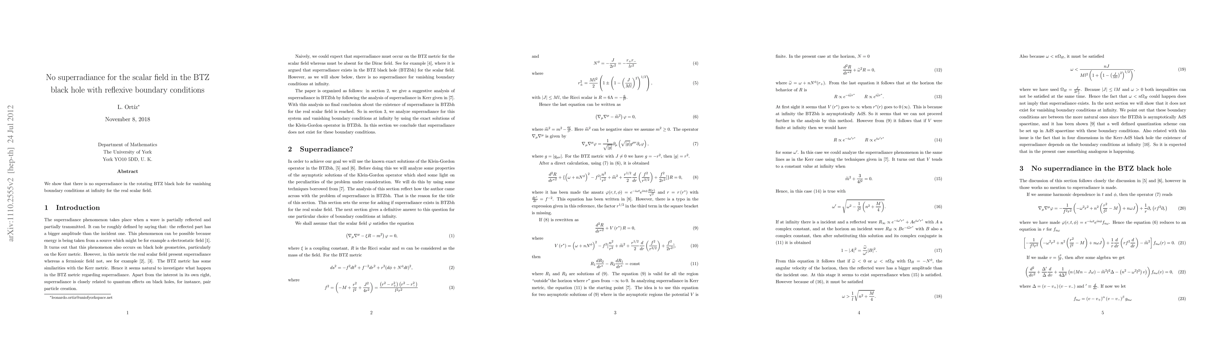 The research analyzes the scalar field in the rotating BTZ black hole using reflexive boundary conditions at infinity, deriving and solving a wave equation for the scalar field to demonstrate the absence of superradiance.