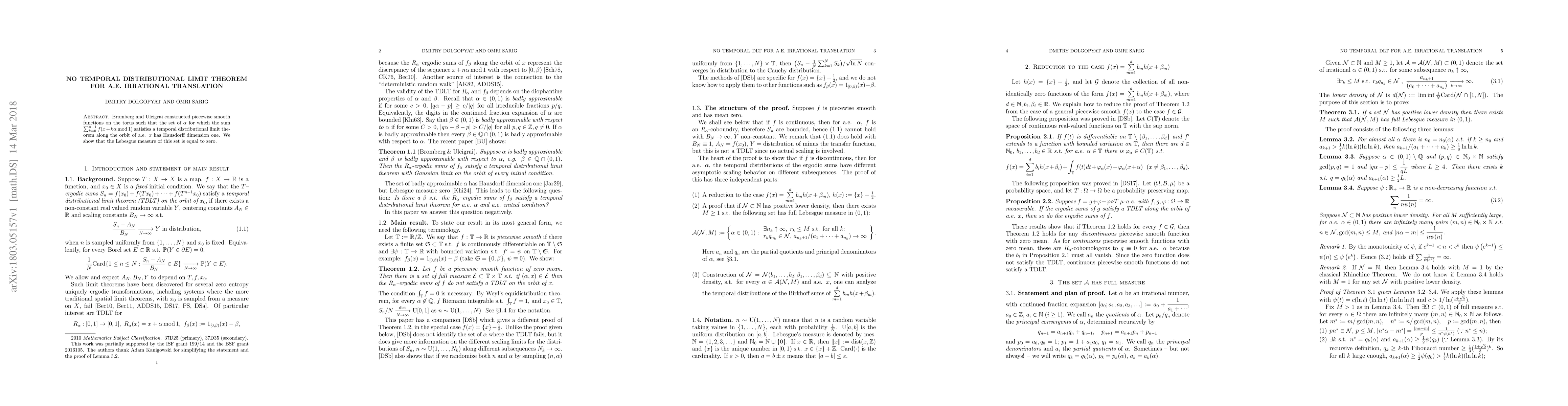 Bromberg and Ulcigrai constructed piecewise smooth functions f on the torus such that the set of angles alpha for which the Birkhoff sums of f with respect to the irrational translation by alpha satisfies a temporal distributional limit theorem along the orbit of a.e. x has Hausdorff dimension one. We show that the Lebesgue measure of this set of angles is equal to zero.
