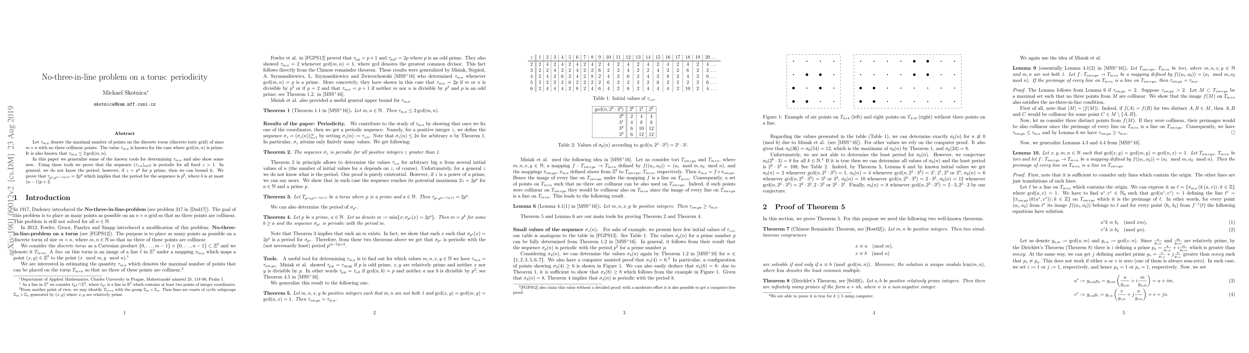 The research paper investigates the no-three-in-line problem on a torus, showing that for fixed z > 1, the sequence of maximal points with no three collinear points is periodic. For z = p^a, where p is prime, it finds an upper bound for the period.