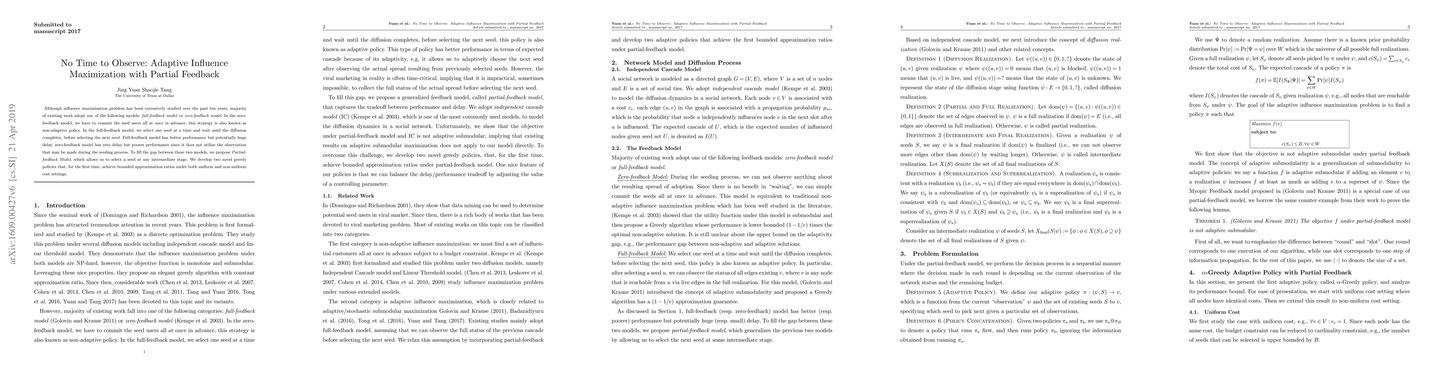 Although influence maximization problem has been extensively studied over the past ten years, majority of existing work adopt one of the following models: \emph{full-feedback model} or \emph{zero-feedback model}. In the zero-feedback model, we have to commit the seed users all at once in advance, this strategy is also known as non-adaptive policy. In the full-feedback model, we select one seed at a time and wait until the diffusion completes, before selecting the next seed. Full-feedback model has better performance but potentially huge delay, zero-feedback model has zero delay but poorer performance since it does not utilize the observation that may be made during the seeding process. To fill the gap between these two models, we propose \emph{Partial-feedback Model}, which allows us to select a seed at any intermediate stage. We develop two novel greedy policies that, for the first time, achieve bounded approximation ratios under both uniform and non-uniform cost settings.