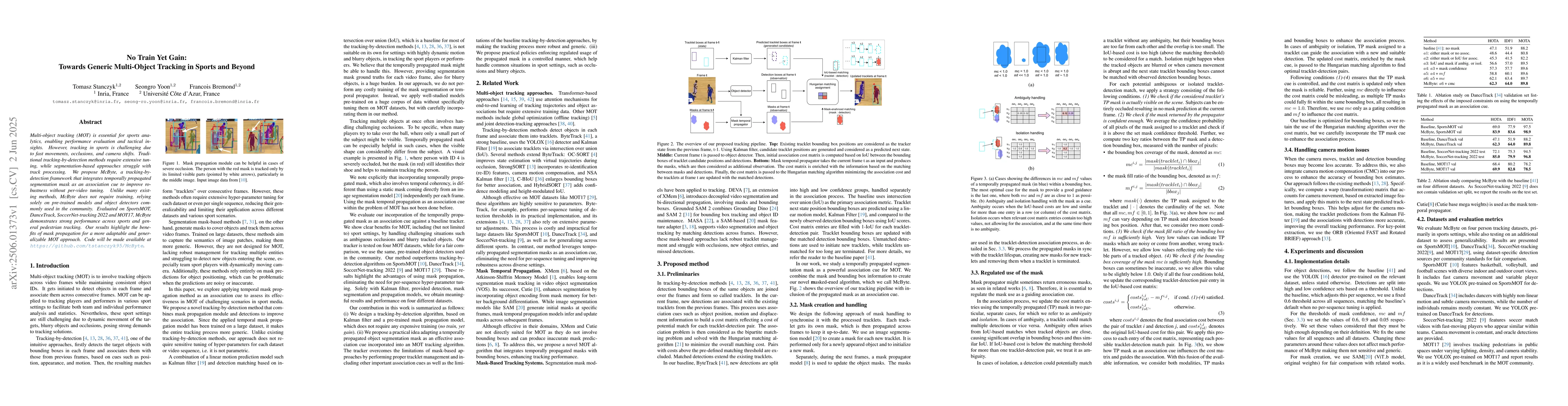 McByte, a tracking-by-detection framework, improves multi-object tracking in sports and beyond by using temporally propagated segmentation masks without requiring per-video tuning or training, achieving strong performance on various datasets.