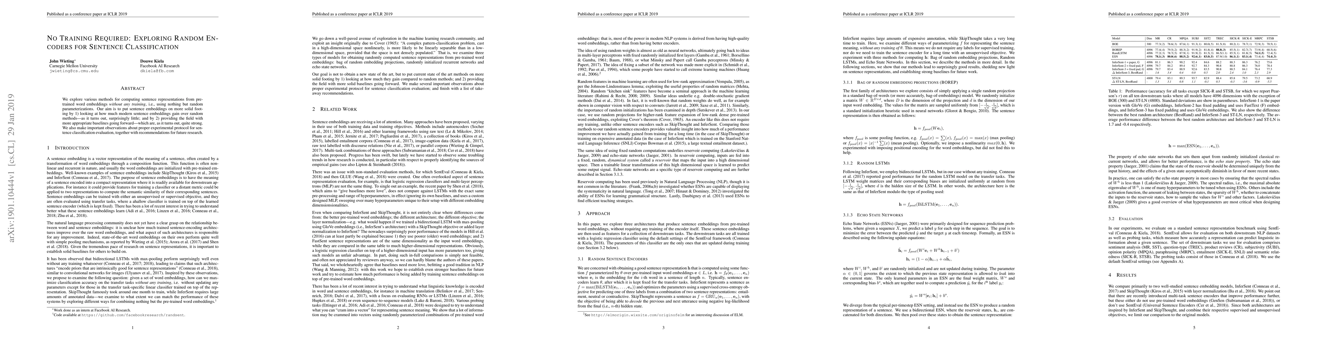 We explore various methods for computing sentence representations from pre-trained word embeddings without any training, i.e., using nothing but random parameterizations. Our aim is to put sentence embeddings on more solid footing by 1) looking at how much modern sentence embeddings gain over random methods---as it turns out, surprisingly little; and by 2) providing the field with more appropriate baselines going forward---which are, as it turns out, quite strong. We also make important observations about proper experimental protocol for sentence classification evaluation, together with recommendations for future research.