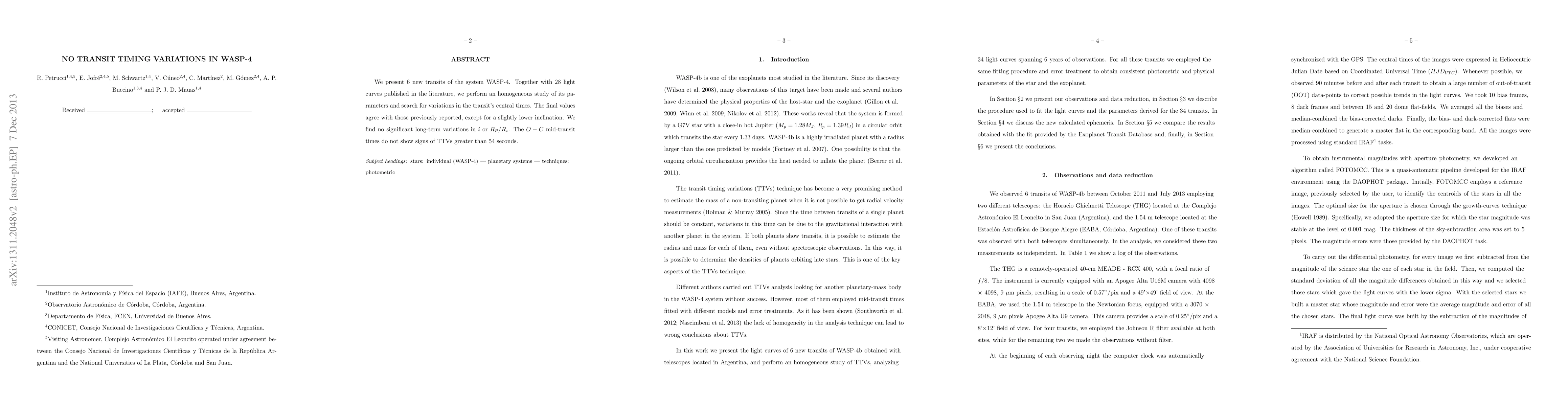 We present 6 new transits of the system WASP-4. Together with 28 light curves published in the literature, we perform an homogeneous study of its parameters and search for variations in the transit's central times. The final values agree with those previously reported, except for a slightly lower inclination. We find no significant long-term variations in $i$ or $R_{P}/R_{\star}$. The $O-C$ mid-transit times do not show signs of TTVs greater than 54 s.