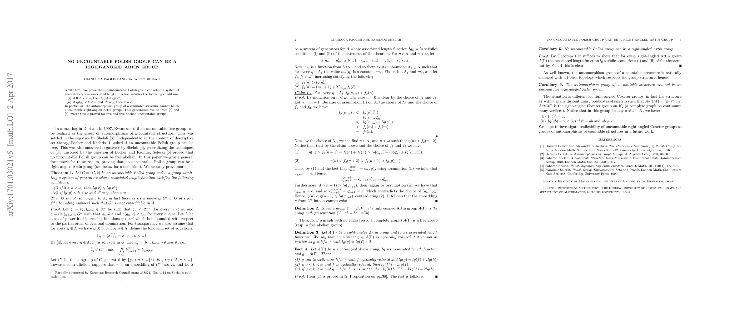 We prove that no uncountable Polish group can admit a system of generators whose associated length function satisfies the following conditions: (i) if $0 < k < \omega$, then $lg(x) \leq lg(x^k)$; (ii) if $lg(y) < k < \omega$ and $x^k = y$, then $x = e$. In particular, the automorphism group of a countable structure cannot be an uncountable right-angled Artin group. This generalizes results from [3] and [5], where this is proved for free and free Abelian uncountable groups.