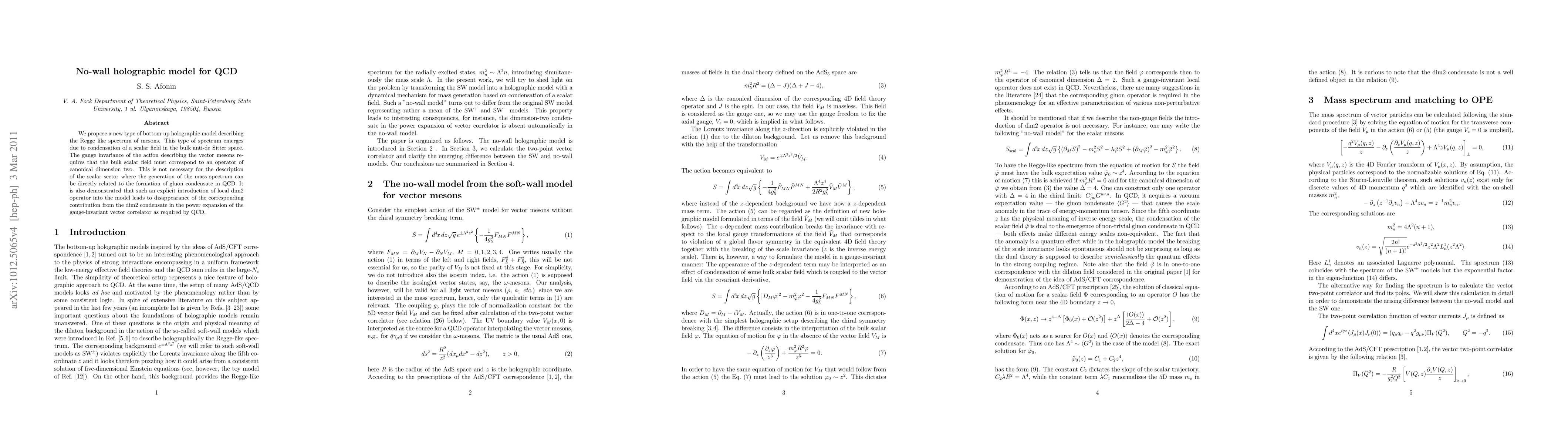 We propose a new type of bottom-up holographic model describing the Regge like spectrum of mesons. This type of spectrum emerges due to condensation of a scalar field in the bulk anti-de Sitter space. The gauge invariance of the action describing the vector mesons requires that the bulk scalar field must correspond to an operator of canonical dimension two. This is not necessary for the description of the scalar sector where the generation of the mass spectrum can be directly related to the formation of gluon condensate in QCD. It is also demonstrated that such an explicit introduction of local dim2 operator into the model leads to disappearance of the corresponding contribution from the dim2 condensate in the power expansion of the gauge-invariant vector correlator as required by QCD.