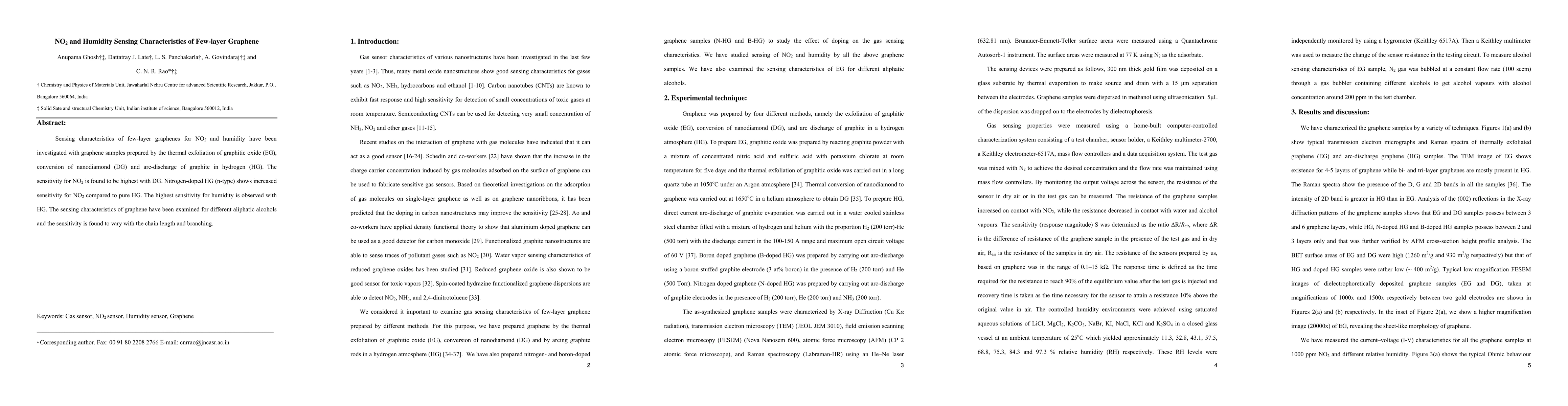 Sensing characteristics of few-layer graphenes for NO2 and humidity have been investigated with graphene samples prepared by the thermal exfoliation of graphitic oxide (EG), conversion of nanodiamond (DG) and arc-discharge of graphite in hydrogen (HG). The sensitivity for NO2 is found to be highest with DG. Nitrogen-doped HG (n-type) shows increased sensitivity for NO2 compared to pure HG. The highest sensitivity for humidity is observed with HG. The sensing characteristics of graphene have been examined for different aliphatic alcohols and the sensitivity is found to vary with the chain length and branching.