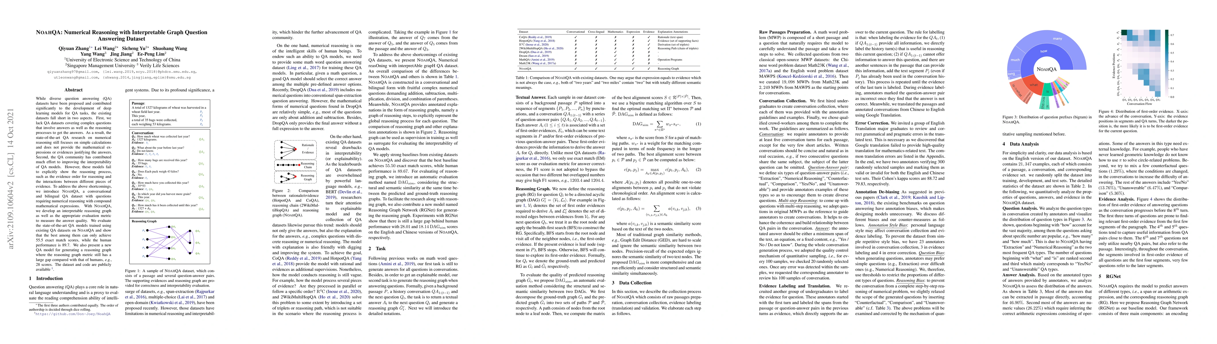 NOAHQA introduces a new dataset for graph-based question answering that requires numerical reasoning and complex mathematical expressions, aiming to improve interpretability and reasoning transparency. Despite state-of-the-art models achieving 55.5% exact match, there remains a significant gap compared to human performance and the new model's interpretability metric.