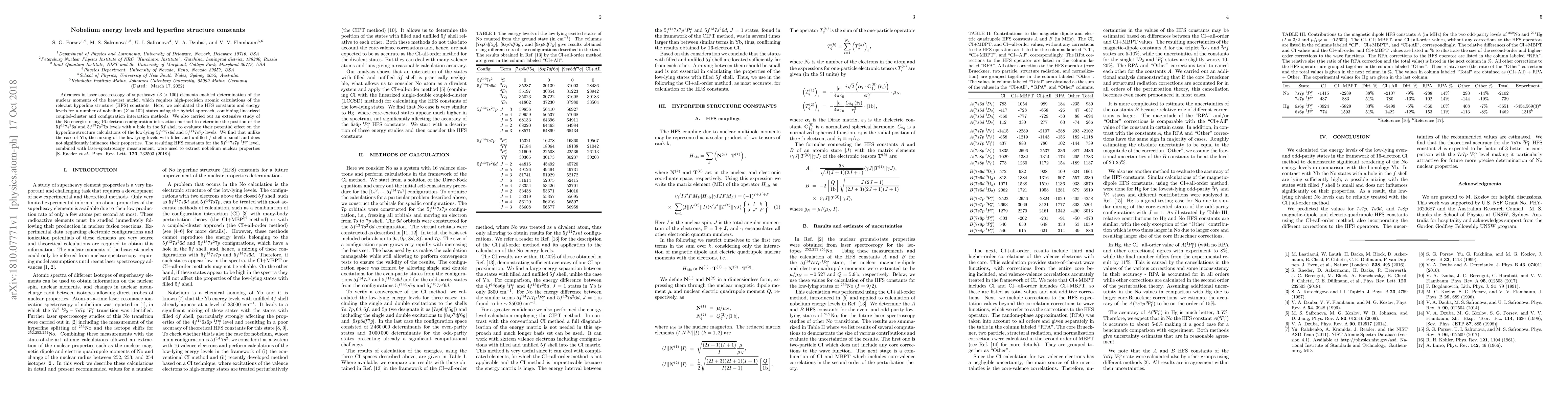 Advances in laser spectroscopy of superheavy ($Z>100$) elements enabled determination of the nuclear moments of the heaviest nuclei, which requires high-precision atomic calculations of the relevant hyperfine structure (HFS) constants. Here, we calculated the HFS constants and energy levels for a number of nobelium (Z=102) states using the hybrid approach, combining linearized coupled-cluster and configuration interaction methods. We also carried out an extensive study of the No energies using 16-electron configuration interaction method to determine the position of the (5f^{13}7s^2 6d) and (5f^{13}7s^2 7p) levels with a hole in the 5f shell to evaluate their potential effect on the hyperfine structure calculations of the low-lying (5f^{14}7s6d) and (5f^{14}7s7p) levels. We find that unlike the case of Yb, the mixing of the low-lying levels with filled and unfilled f shell is small and does not significantly influence their properties. The resulting HFS constants for the 5f^{14}7s7p 1P1 level, combined with laser-spectroscopy measurement, were used to extract nobelium nuclear properties [S. Raeder et al., Phys. Rev. Lett. 120, 232503 (2018)]