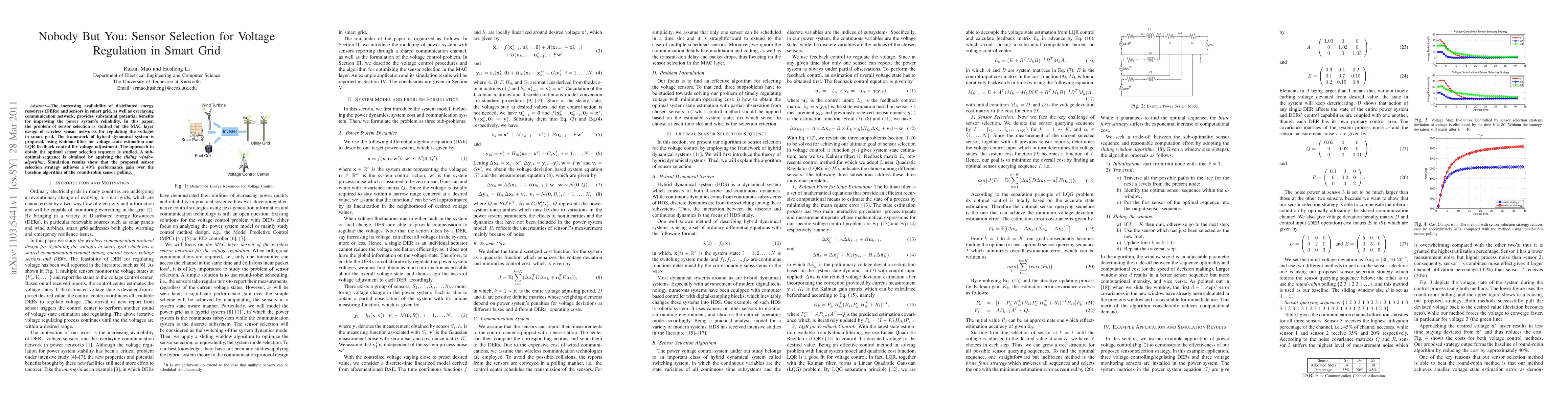 The increasing availability of distributed energy resources (DERs) and sensors in smart grid, as well as overlaying communication network, provides substantial potential benefits for improving the power system's reliability. In this paper, the problem of sensor selection is studied for the MAC layer design of wireless sensor networks for regulating the voltages in smart grid. The framework of hybrid dynamical system is proposed, using Kalman filter for voltage state estimation and LQR feedback control for voltage adjustment. The approach to obtain the optimal sensor selection sequence is studied. A sub- optimal sequence is obtained by applying the sliding window algorithm. Simulation results show that the proposed sensor selection strategy achieves a 40% performance gain over the baseline algorithm of the round-robin sensor polling.
