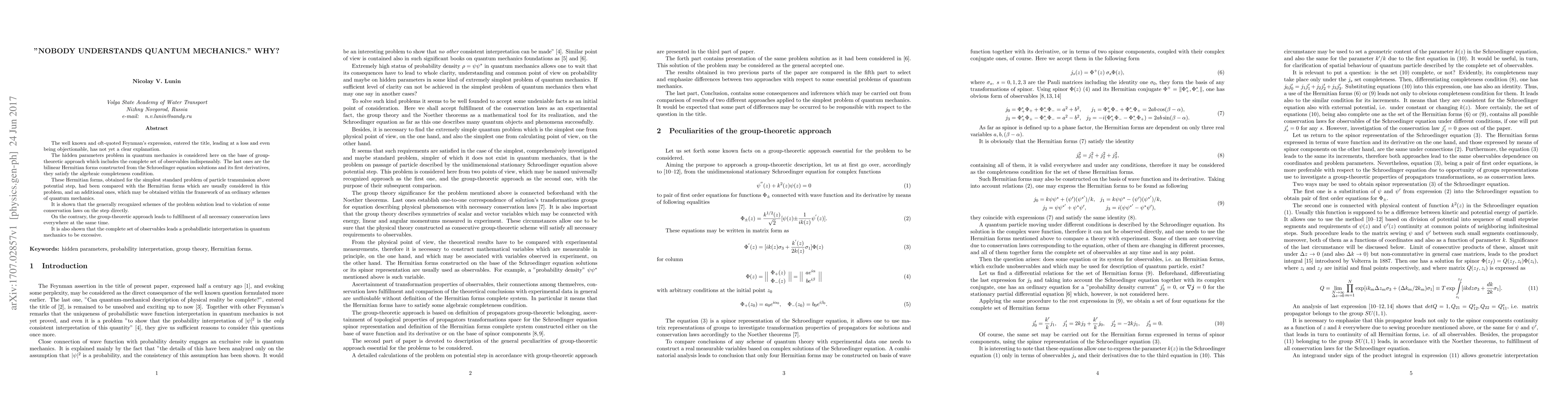 The well known and oft-quoted Feynman's expression, entered the title, leading at a loss and even being objectionable, has not yet a clear explanation. The hidden parameters problem in quantum mechanics is considered here on the base of group-theoretic approach which includes the complete set of observables indispensably. The last ones are the bilinear Hermitian forms constructed from the Schroedinger equation solutions and its first derivatives, they satisfy the algebraic completeness condition. These Hermitian forms, obtained for the simplest standard problem of particle transmission above potential step, had been compared with the Hermitian forms which are usually considered in this problem, and an additional ones, which may be obtained within the framework of an ordinary schemes of quantum mechanics. It is shown that the generally recognised schemes of the problem solution lead to violation of some conservation laws on the step directly. On the contrary, the group-theoretic approach leads to fulfillments of all necessary conservation laws everywhere at the same time. It is also shown that the complete set of observables leads a probabilistic interpretation in quantum mechanics to be excessive.