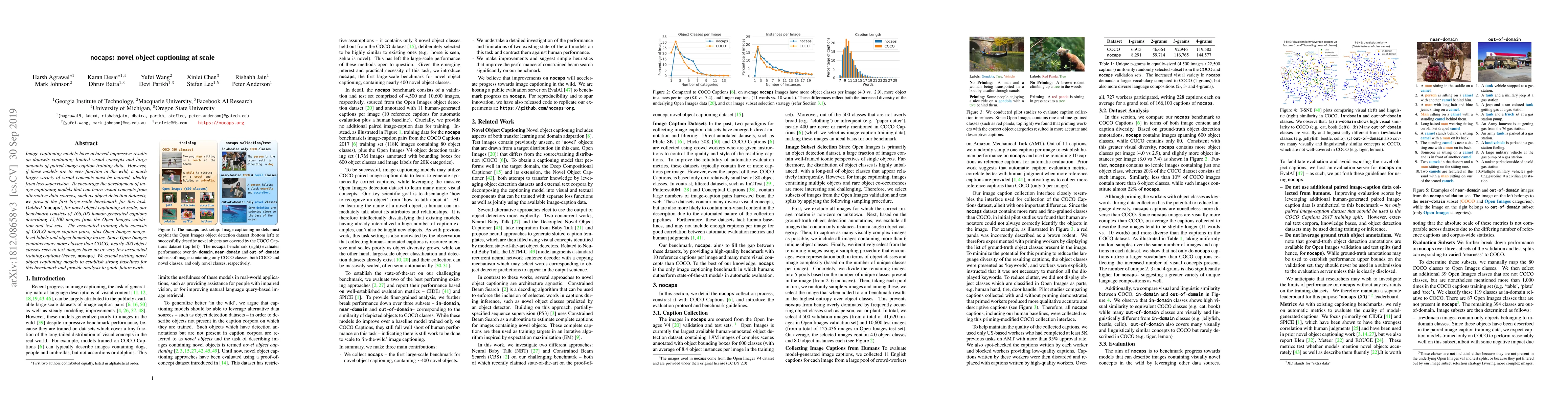 The paper introduces the 'nocaps' benchmark for novel object captioning at scale, featuring 166,100 captions for 15,100 images from OpenImages, aiming to develop captioning models that can learn from diverse visual concepts with less supervision. The benchmark includes training data from COCO and OpenImages, highlighting the challenge of captioning objects with limited training captions.