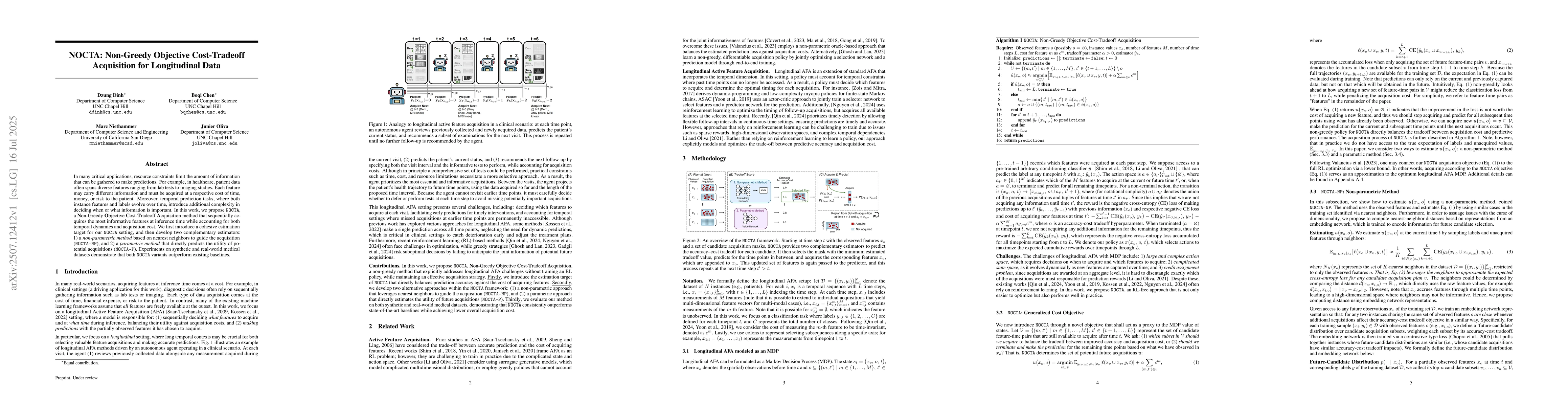 This research is significant as it introduces a novel, non-greedy active feature acquisition method (NOCTA) for longitudinal data, which balances acquisition cost with prediction accuracy, potentially minimizing patient burden in healthcare applications by selectively acquiring essential examinations.