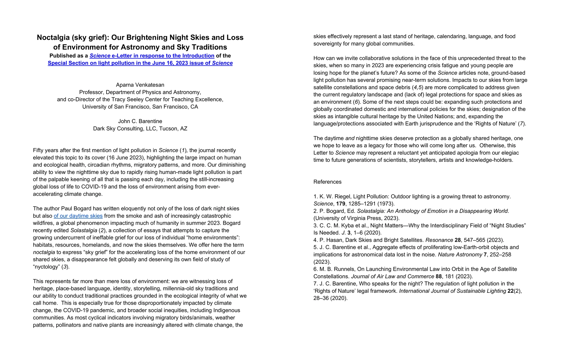 Summary: This paper introduces "noctalgia" to describe the "sky grief" caused by increasing light pollution, impacting human and ecological health, and disrupting traditional sky-related practices. It calls for measures to protect both night and day skies to preserve scientific and cultural heritage.
