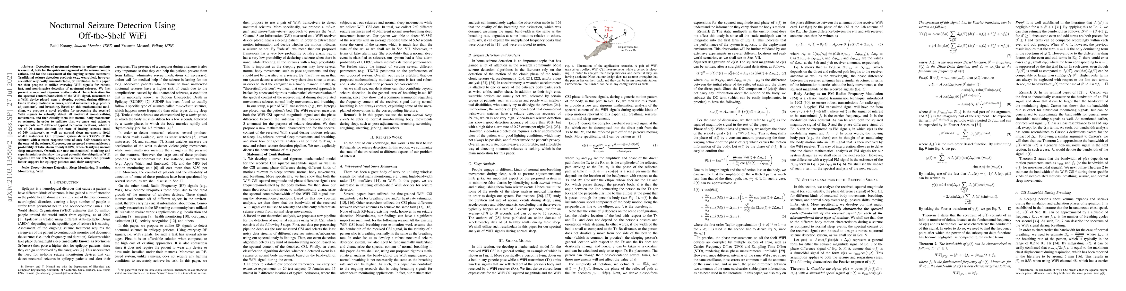 This paper proposes a novel method for detecting nocturnal seizures using off-the-shelf WiFi signals, offering a cost-effective, non-invasive alternative to traditional seizure detection devices. The study rigorously models WiFi signal spectral content and demonstrates a detection system achieving 93.85% accuracy with a low false alarm rate of 0.0097.