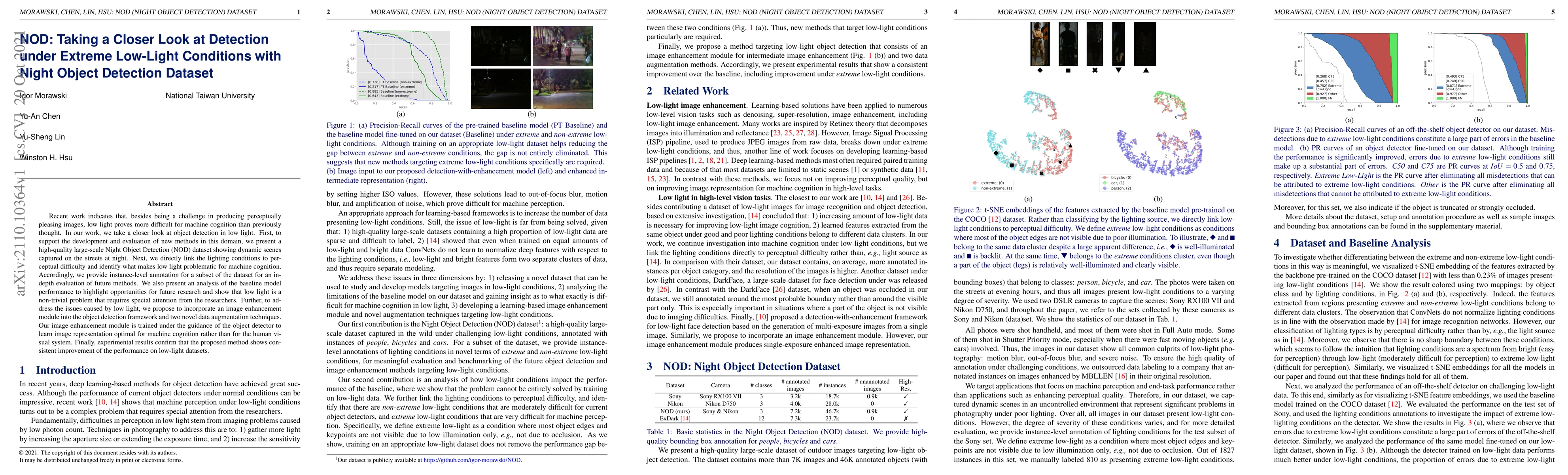Recent work indicates that, besides being a challenge in producing perceptually pleasing images, low light proves more difficult for machine cognition than previously thought. In our work, we take a closer look at object detection in low light. First, to support the development and evaluation of new methods in this domain, we present a high-quality large-scale Night Object Detection (NOD) dataset showing dynamic scenes captured on the streets at night. Next, we directly link the lighting conditions to perceptual difficulty and identify what makes low light problematic for machine cognition. Accordingly, we provide instance-level annotation for a subset of the dataset for an in-depth evaluation of future methods. We also present an analysis of the baseline model performance to highlight opportunities for future research and show that low light is a non-trivial problem that requires special attention from the researchers. Further, to address the issues caused by low light, we propose to incorporate an image enhancement module into the object detection framework and two novel data augmentation techniques. Our image enhancement module is trained under the guidance of the object detector to learn image representation optimal for machine cognition rather than for the human visual system. Finally, experimental results confirm that the proposed method shows consistent improvement of the performance on low-light datasets.