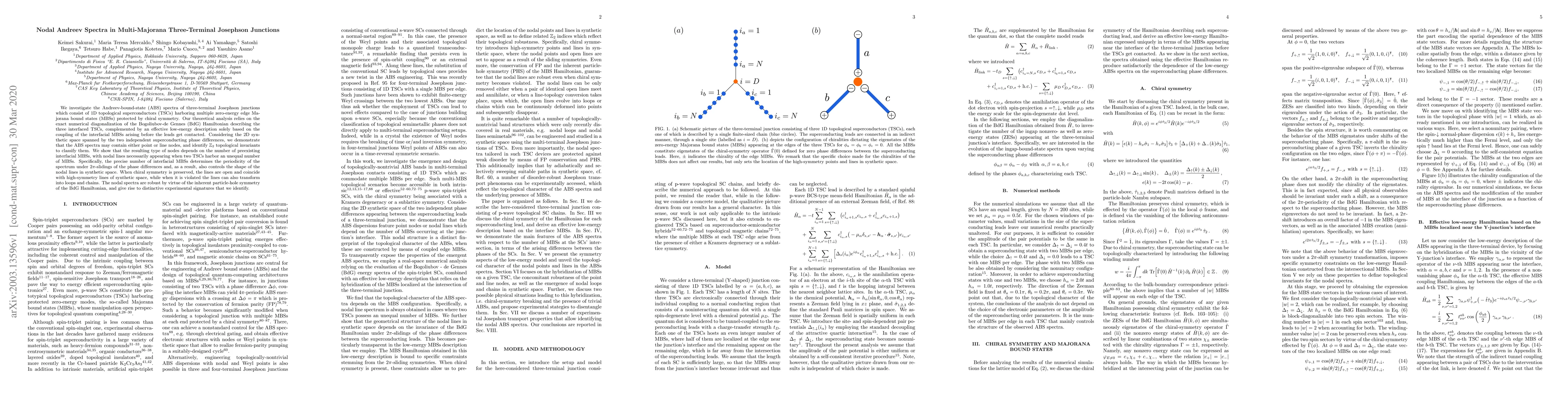Researchers investigate Andreev-bound-state spectra in multi-Majorana three-terminal Josephson junctions, finding that the spectra can contain point or line nodes depending on the number of preexisting interfacial MBSs, with nodal lines appearing when two TSCs harbor an unequal number of MBSs.