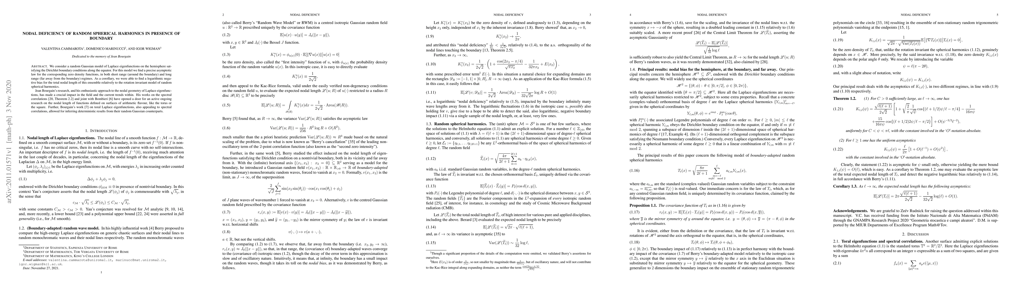 We consider a random Gaussian model of Laplace eigenfunctions on the hemisphere satisfying the Dirichlet boundary conditions along the equator. For this model we find a precise asymptotic law for the corresponding zero density functions, in both short range (around the boundary) and long range (far away from the boundary) regimes. As a corollary, we were able to find a logarithmic negative bias for the total nodal length of this ensemble relatively to the rotation invariant model of random spherical harmonics. Jean Bourgain's research, and his enthusiastic approach to the nodal geometry of Laplace eigenfunctions, has made a crucial impact in the field and the current trends within. His works on the spectral correlations (Theorem 2.2 in Krishnapur, Kurlberg and Wigman (2013)) and joint with Bombieri (Bourgain and Bombieri (2015)) have opened a door for an active ongoing research on the nodal length of functions defined on surfaces of arithmetic flavour, like the torus or the square. Further, Bourgain's work on toral Laplace eigenfunctions (Bourgain (2014)), also appealing to spectral correlations, allowed for inferring deterministic results from their random Gaussian counterparts.