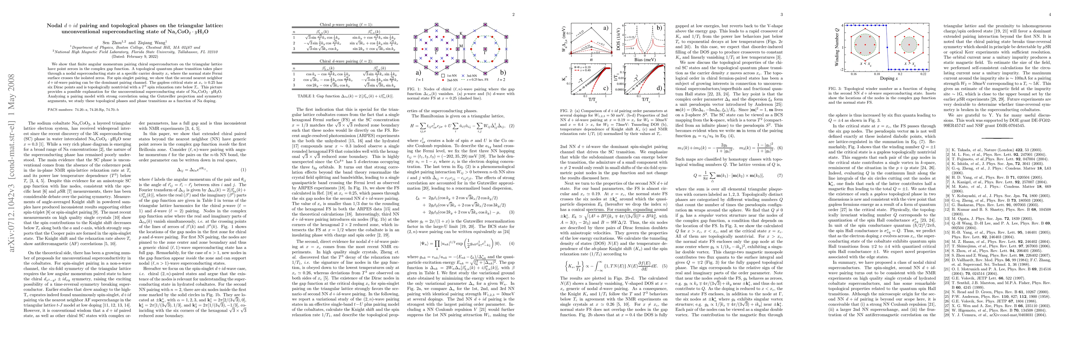 This paper explores unconventional superconductivity in Na$_x$CoO$_2\cdot y$H$_2$O, proposing a $d+id$ pairing mechanism leading to topologically nontrivial nodal states and quantum phase transitions on the triangular lattice. The study reveals a critical doping level where a topologically protected gapless phase with Dirac points emerges.