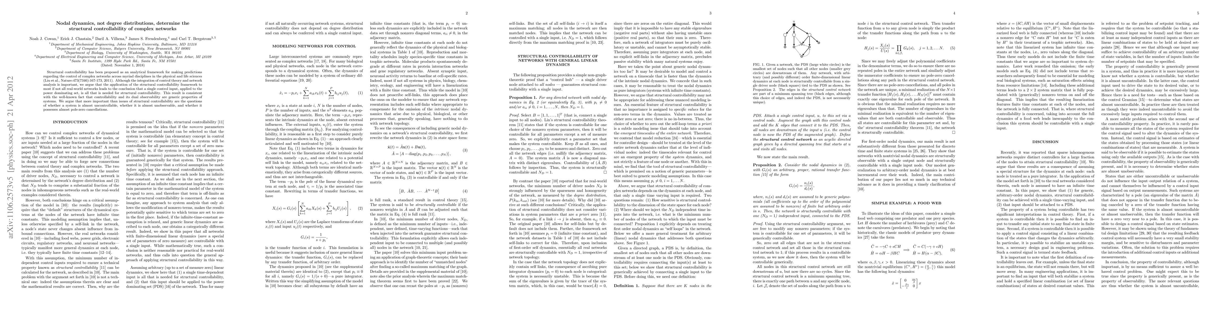 This paper argues that the structural controllability of complex networks is primarily determined by nodal dynamics rather than degree distributions, and that a single control input to the power dominating set is sufficient for controllability. It emphasizes the importance of assessing system observability and potential pole-zero cancellations over structural controllability alone.
