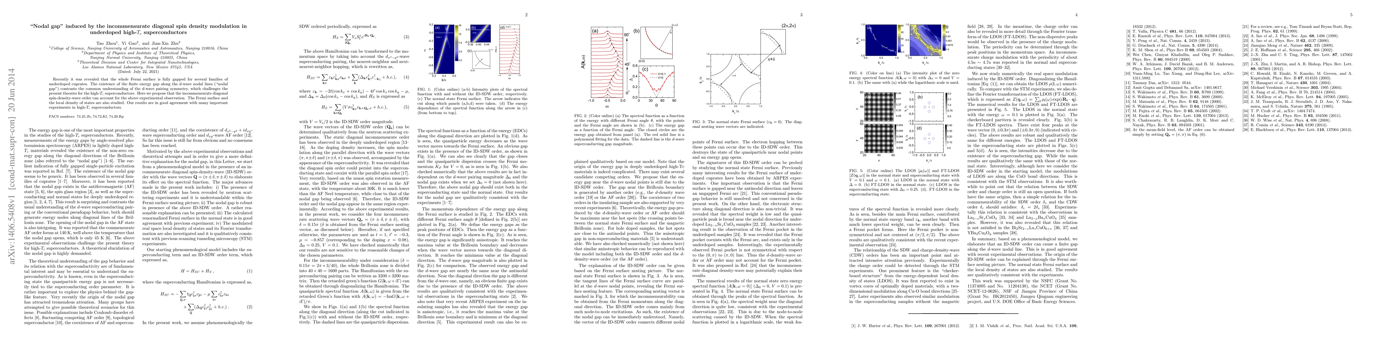 Recently it was revealed that the whole Fermi surface is fully gapped for several families of underdoped cuprates. The existence of the finite energy gap along the $d$-wave nodal lines ("nodal gap") contrasts the common understanding of the $d$-wave pairing symmetry, which challenges the present theories for the high-$T_c$ superconductors. Here we propose that the incommensurate diagonal spin-density-wave order can account for the above experimental observation. The Fermi surface and the local density of states are also studied. Our results are in good agreement with many important experiments in high-$T_c$ superconductors.
