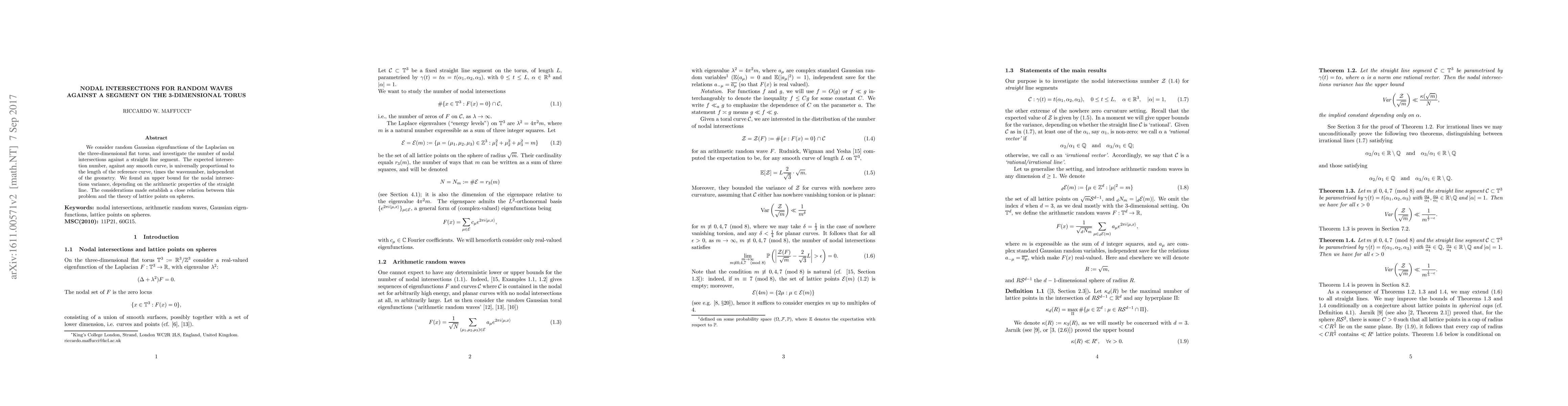 We consider random Gaussian eigenfunctions of the Laplacian on the three-dimensional flat torus, and investigate the number of nodal intersections against a straight line segment. The expected intersection number, against any smooth curve, is universally proportional to the length of the reference curve, times the wavenumber, independent of the geometry. We found an upper bound for the nodal intersections variance, depending on the arithmetic properties of the straight line. The considerations made establish a close relation between this problem and the theory of lattice points on spheres.