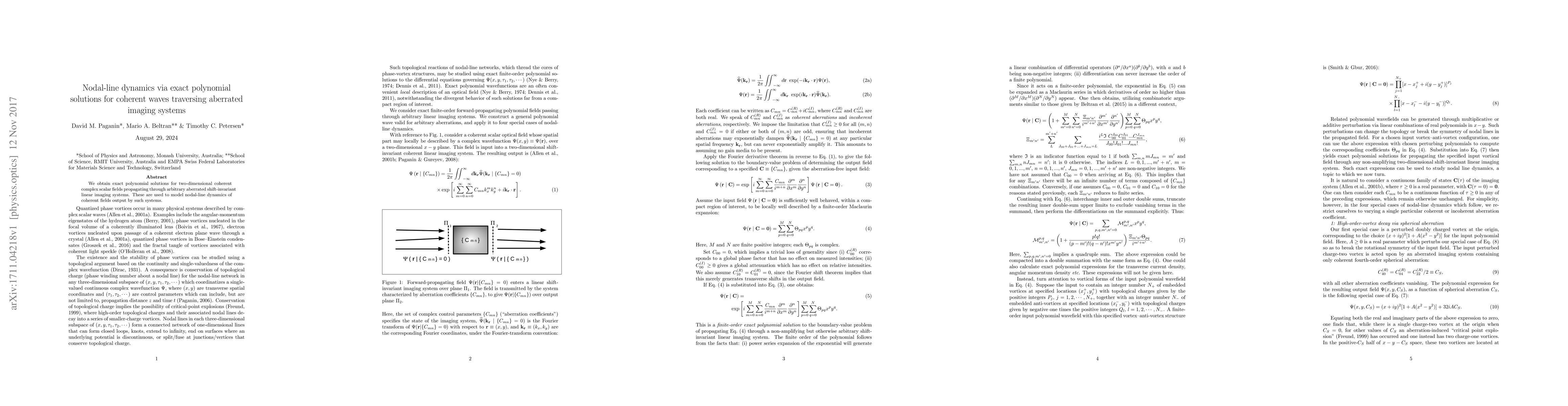 Summary: This research develops exact polynomial solutions for coherent scalar fields in aberrated imaging systems, providing a mathematical framework to model the dynamics of nodal lines in the resulting coherent outputs.