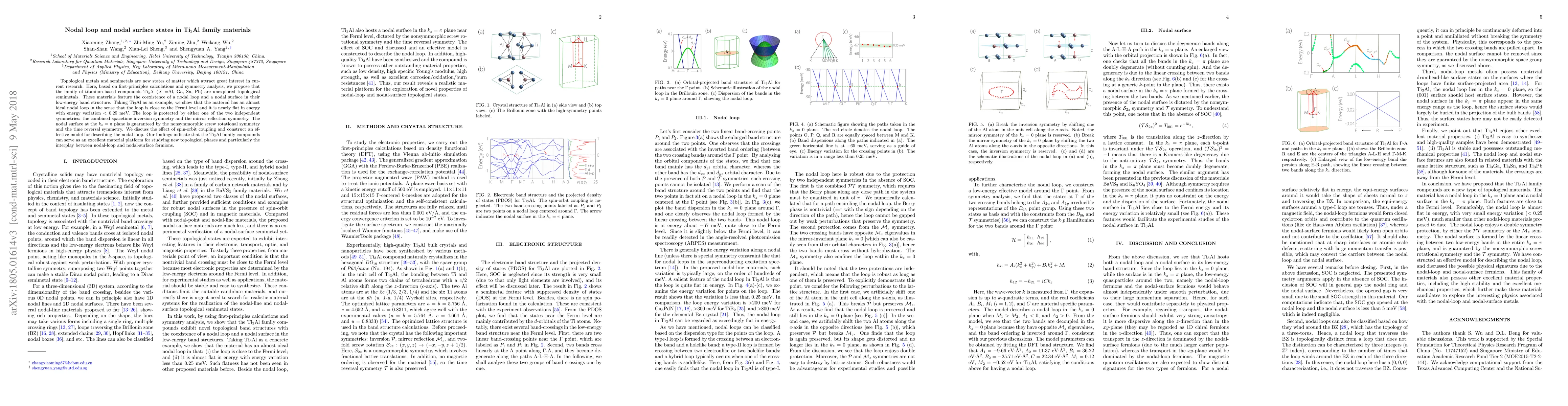 The paper identifies titanium-based compounds Ti3X (X=Al, Ga, Sn, Pb) as unexplored topological semimetals featuring both nodal loops and nodal surfaces in their band structures, with Ti3Al exemplifying an almost ideal nodal loop near the Fermi level. These materials' unique topological properties are protected by specific symmetries and could provide a platform for studying topological phases.