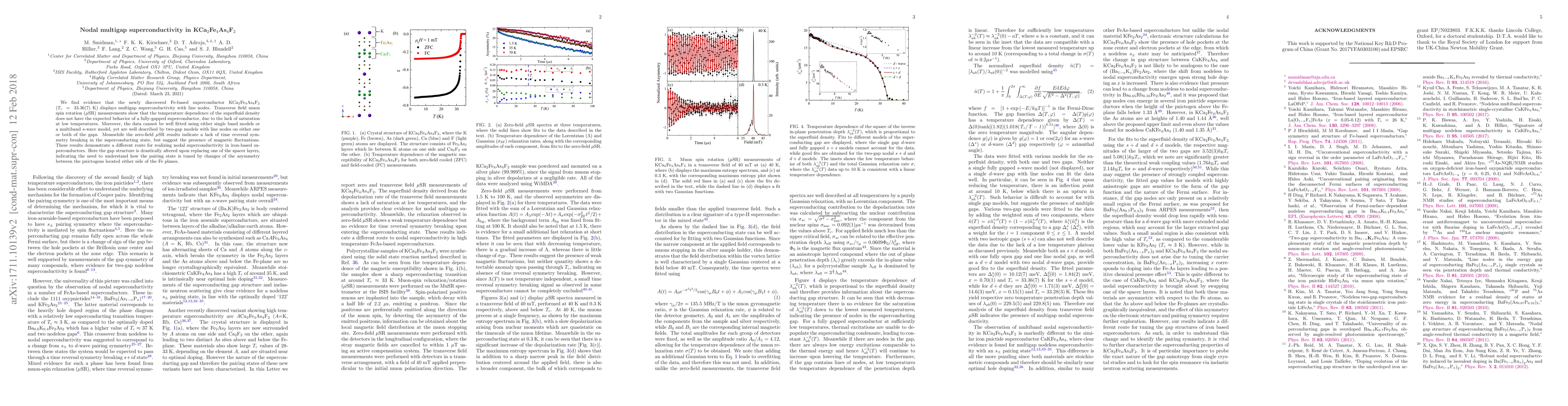 The Fe-based superconductor KCa$_2$Fe$_4$As$_4$F$_2$ exhibits multigap superconductivity with line nodes, as evidenced by transverse field $\mu$SR measurements indicating unusual superfluid density behavior and magnetic fluctuations. The unique gap structure suggests that altering spacer layers significantly affects the pairing state.