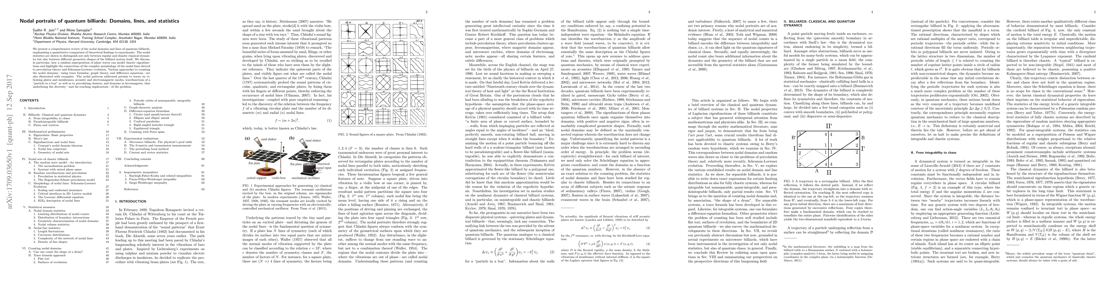 This paper reviews the nodal domains and lines in quantum billiards, comparing theoretical models with experimental results. It highlights how nodal statistics differentiate between regular and chaotic dynamics, and various shapes, using diverse modeling techniques and illustrating applications across different wave phenomena.