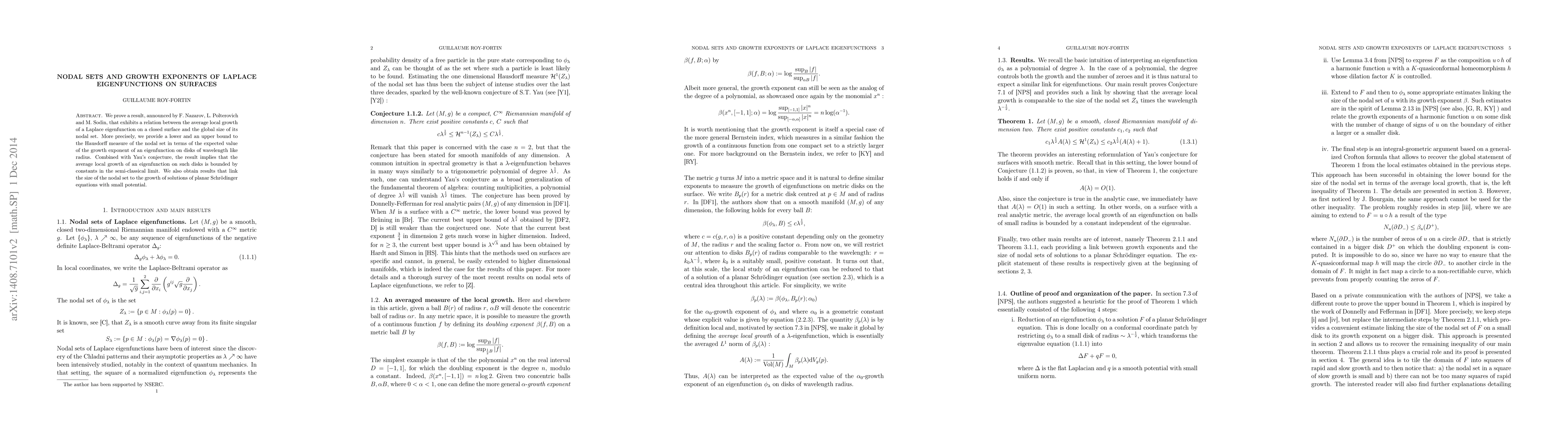 This paper establishes a connection between the average local growth of Laplace eigenfunctions on closed surfaces and the size of their nodal sets, providing bounds for the Hausdorff measure of the nodal set in terms of the eigenfunction's growth exponent. It also links the nodal set size to the growth of solutions for planar Schrödinger equations with small potentials.
